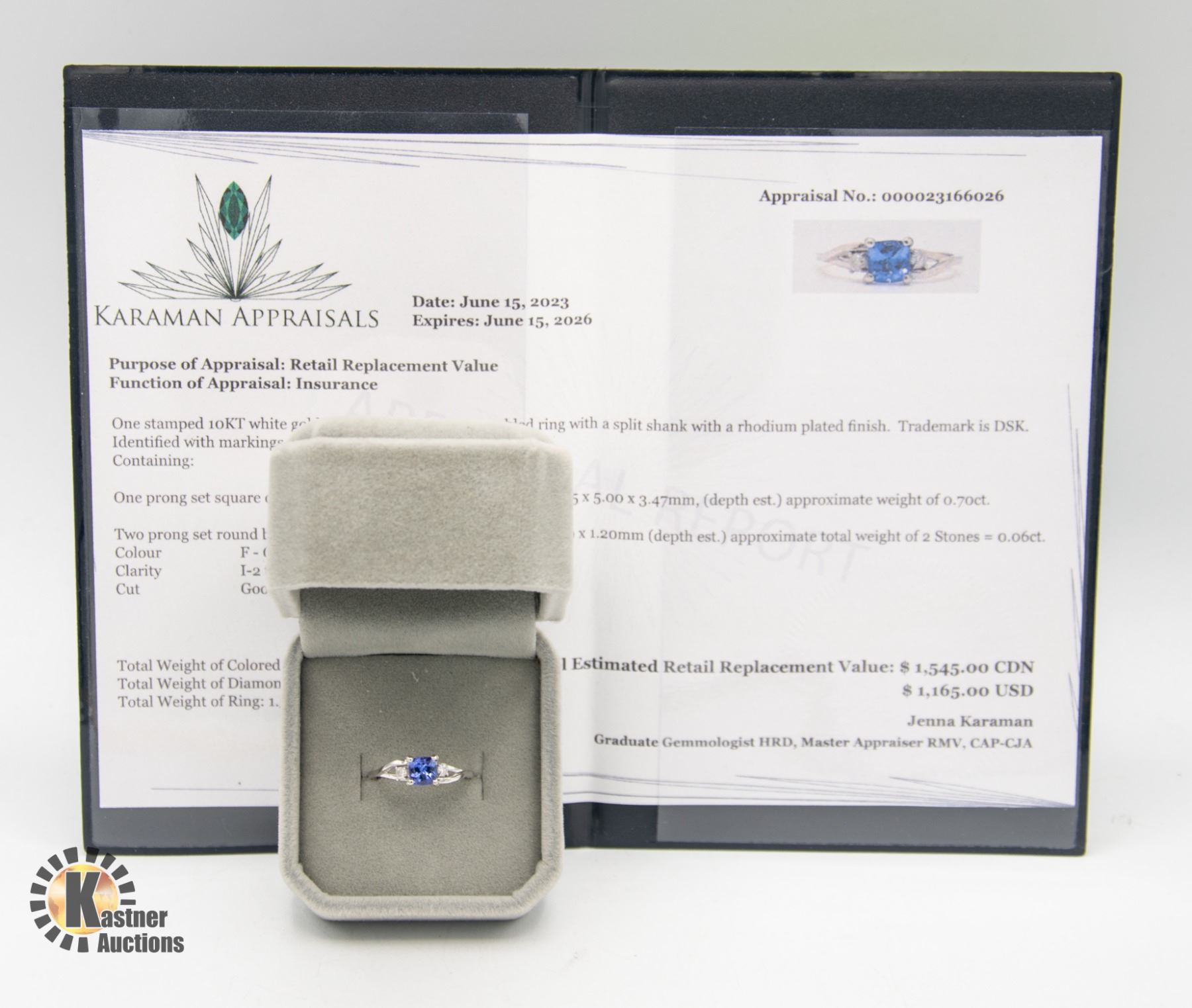 TANZANITE WITH 2 DIAMONDS WEIGHING 0.06 CT APPRAISED VALUE $1,545.00 SIZE 6 **ALL ITEMS MUST BE REMOVED BY 5PM SATURDAY, AUGUST 12TH 2023. ALL REMAINING ITEMS WILL BE SUBJECT TO A $6.00 PER DAY STORAGE CHARGE. ANY ITEMS REMAINING AFTER MONDAY, AUGUST 28TH, 2023 WILL BE CONSIDERED FORFEITED. NO REFUNDS WILL BE ISSUED FOR FORFEITED ITEMS. TO SCHEDULE A PICK UP APPOINTMENT CLICK HERE