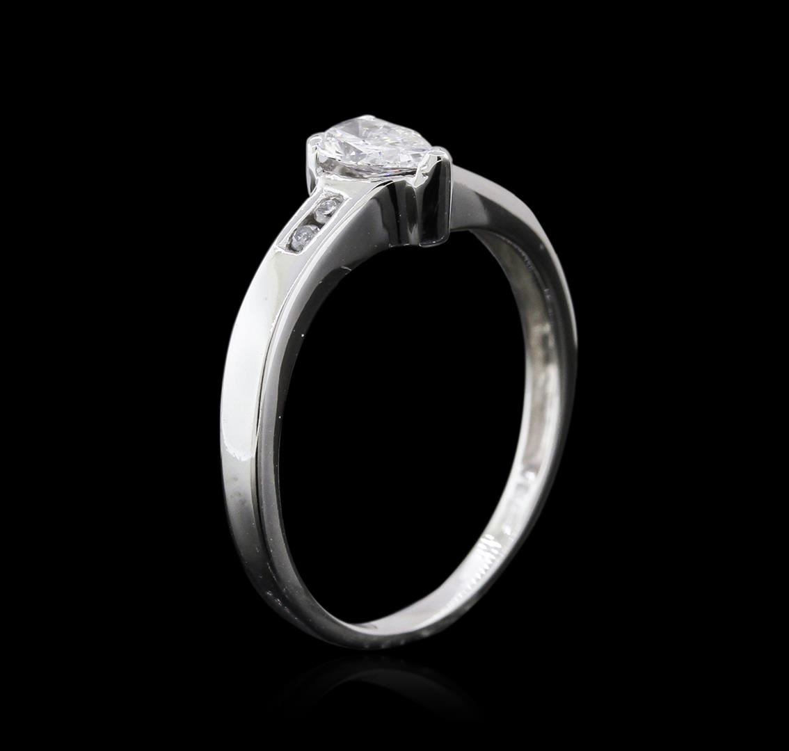 One electronically tested 10KT white gold ladies cast diamond engagement wedding ring with a flat shank with rounded edges with a bright polish finish. Identified with markings of "10K". Condition is new. Containing: One prong set pear shaped cut diamond, measuring 6.80 x 3.68 x 1.93mm (depth est.) approximate weight of 0.28ct. Clarity: I-1. Color: H, Cut is Good. Four channel set round brilliant cut diamonds, measuring 1.30 - 1.30 x 0.78mm (depth est.) approximate total weight of 4 Stones = 0.03ct. Clarity: I-1 to I-3. Color: H - I, Cut is Good. Diamonds are graded in the mounting, unless otherwise stated. Total Weight of Diamonds 0.31ct. Total Weight of Solitaire Wedding Ring 1.70 grams. GGL Appraised at $925.00.