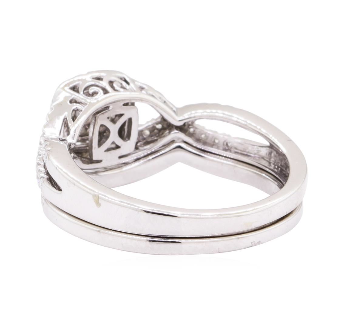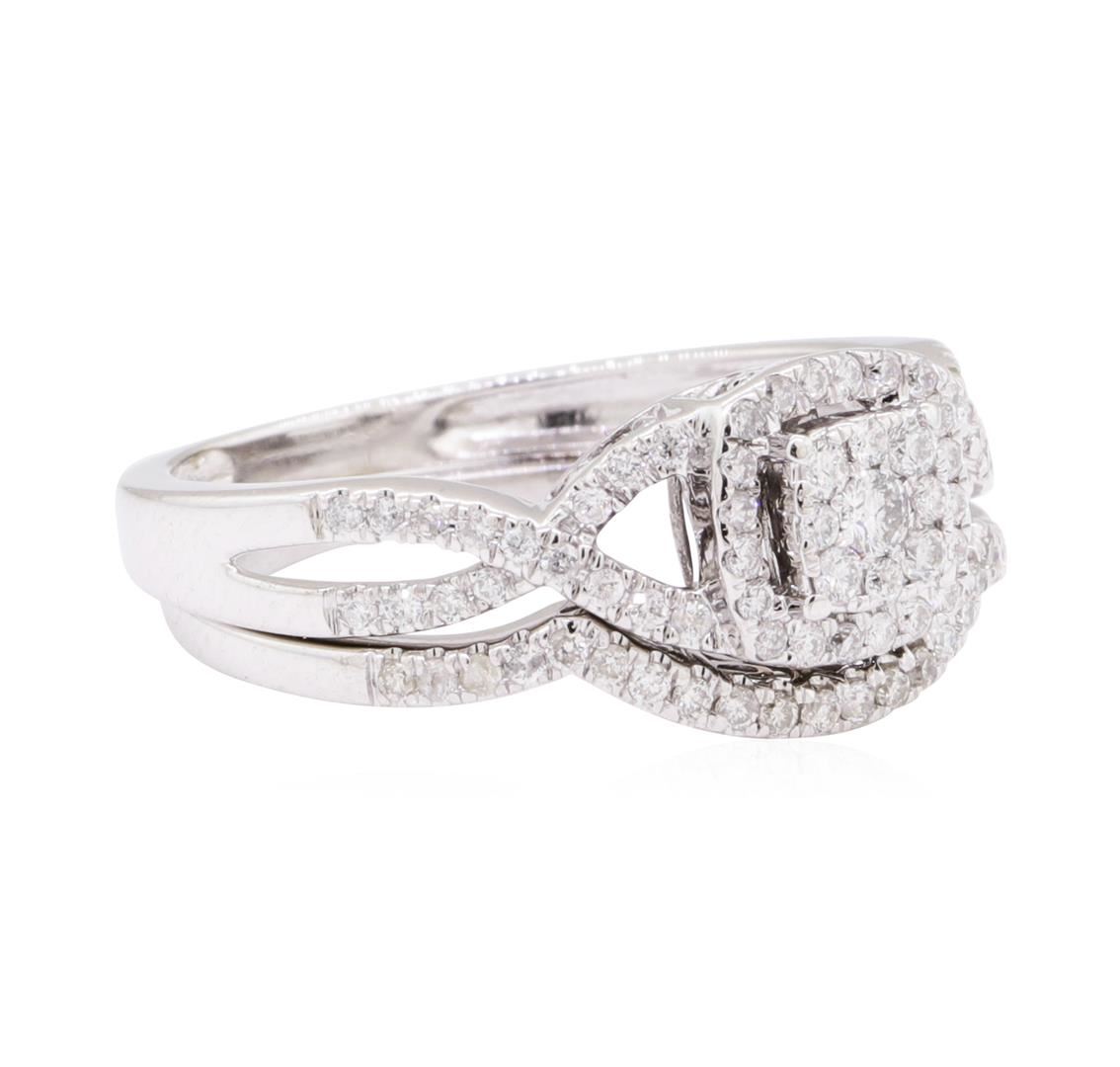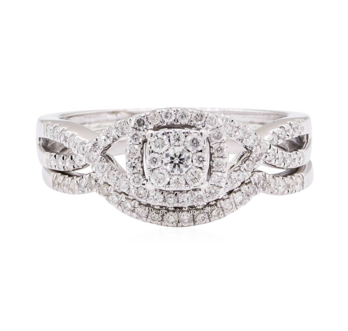 One crossover halo wedding set featuring: 10KT white gold weighing 4.5 grams containing diamonds weighing 0.60ctw. The rings are size 7.