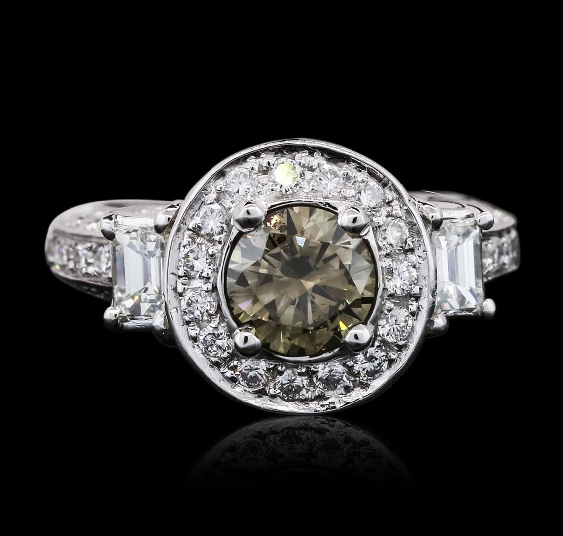 One electronically tested 10KT white gold ladies cast diamond ring with a bright polish finish. The featured diamond is set within a diamond bezel supported by diamond set shoulders, completed by a three millimeter wide band. Condition is new, good workmanship. Containing: One prong set round brilliant cut diamond, measuring 6.70 - 6.60 x 3.85mm (depth est.) approximate weight of 1.14ct. Graded in the setting. Clarity: I-1. Depth: 57.9%. Table 63.2%. Two prong set emerald shaped cut diamonds, measuring 4.30 x 3.20 x 2.20mm (depth est.) approximate total weight of 2 Stones = 0.65ct. Graded in the setting. Clarity: VS-1. Color: I Forty-Seven prong set round brilliant cut diamonds, measuring 1.80 - 1.70 x 1.05mm (depth est.) approximate total weight of 47 Stones = 1.02ct. Graded in the setting. Clarity: SI-1 to I-1. Color: G - I. Total Weight of Diamonds 2.81ct. Total Weight of Ring 7.18 grams. AIG Appraised at $12,200.00.