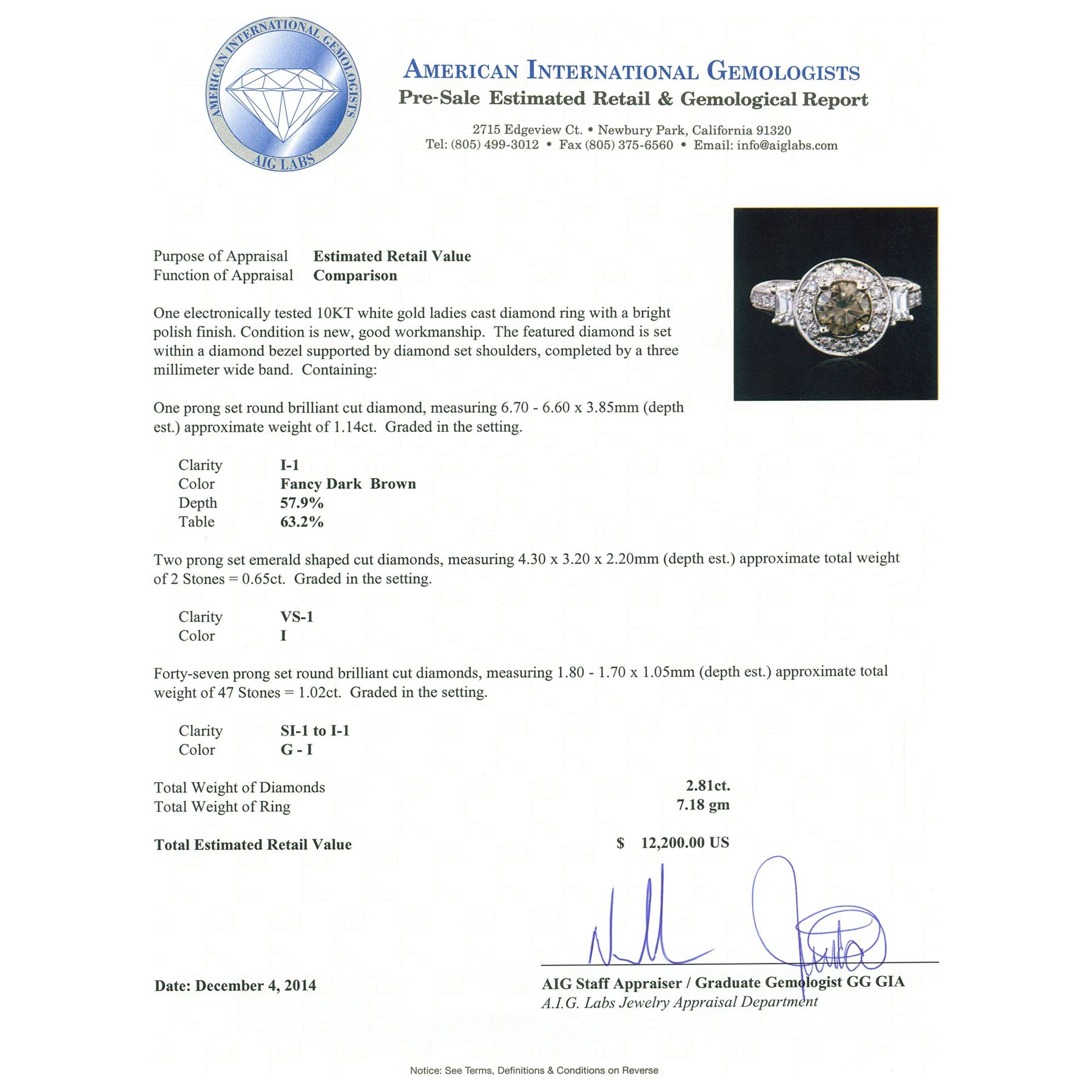 One electronically tested 10KT white gold ladies cast diamond ring with a bright polish finish. The featured diamond is set within a diamond bezel supported by diamond set shoulders, completed by a three millimeter wide band. Condition is new, good workmanship. Containing: One prong set round brilliant cut diamond, measuring 6.70 - 6.60 x 3.85mm (depth est.) approximate weight of 1.14ct. Graded in the setting. Clarity: I-1. Depth: 57.9%. Table 63.2%. Two prong set emerald shaped cut diamonds, measuring 4.30 x 3.20 x 2.20mm (depth est.) approximate total weight of 2 Stones = 0.65ct. Graded in the setting. Clarity: VS-1. Color: I Forty-Seven prong set round brilliant cut diamonds, measuring 1.80 - 1.70 x 1.05mm (depth est.) approximate total weight of 47 Stones = 1.02ct. Graded in the setting. Clarity: SI-1 to I-1. Color: G - I. Total Weight of Diamonds 2.81ct. Total Weight of Ring 7.18 grams. AIG Appraised at $12,200.00.