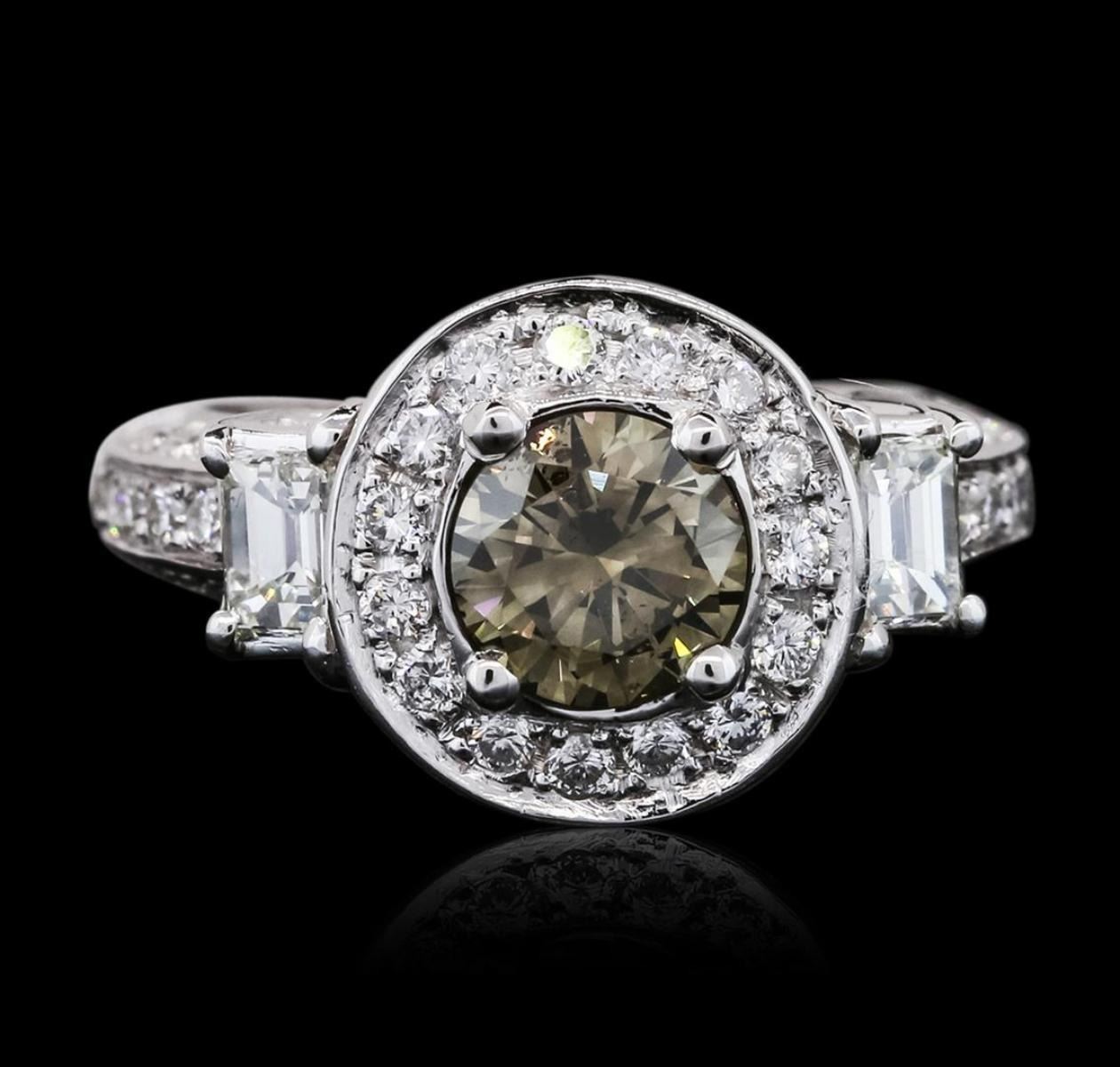 One electronically tested 10KT white gold ladies cast diamond ring with a bright polish finish. The featured diamond is set within a diamond bezel supported by diamond set shoulders, completed by a three millimeter wide band. Condition is new, good workmanship. Containing: One prong set round brilliant cut diamond, measuring 6.70 - 6.60 x 3.85mm (depth est.) approximate weight of 1.14ct. Graded in the setting. Clarity: I-1. Depth: 57.9%. Table 63.2%. Two prong set emerald shaped cut diamonds, measuring 4.30 x 3.20 x 2.20mm (depth est.) approximate total weight of 2 Stones = 0.65ct. Graded in the setting. Clarity: VS-1. Color: I Forty-Seven prong set round brilliant cut diamonds, measuring 1.80 - 1.70 x 1.05mm (depth est.) approximate total weight of 47 Stones = 1.02ct. Graded in the setting. Clarity: SI-1 to I-1. Color: G - I. Total Weight of Diamonds 2.81ct. Total Weight of Ring 7.18 grams. AIG Appraised.