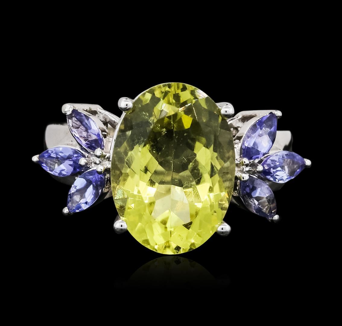 One ring featuring: 10KT white gold weighing 5.00 grams containing one lemon quartz center stone with a total weight of 6.00ct and six tanzanites with a total weight of 0.84cts.