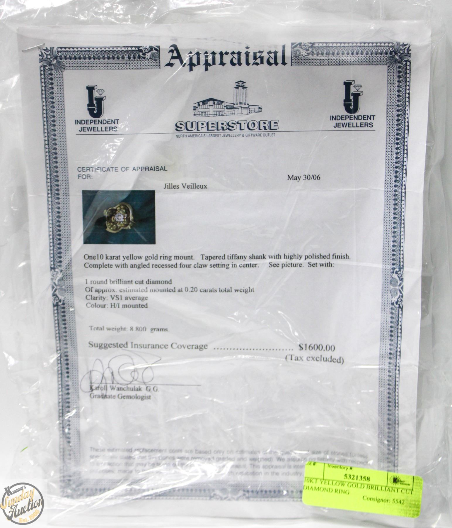 TAPERED TIFFANY SHANK WITH HIGHLY POLISHED FINISH, COMPLETE WITH ANGLED RECESSED FOUR CLAW SETTING IN CENTRE, SET WITH 0.20CT VS1 H/I DIAMOND, TOTAL WEIGHT 8.8GM, COMES WITH 2006 APPRAISAL FROM INDEPENDANT JEWELLERS WITH INSURANCE REPLACEMENT VALUE OF $1,600.00 SIZE 10 **ALL ITEMS MUST BE REMOVED BY 5PM SATURDAY, MAY 17TH 2025. ALL REMAINING ITEMS WILL BE SUBJECT TO A $6.00 PER DAY STORAGE CHARGE. ANY ITEMS REMAINING AFTER MONDAY, JUNE 2ND 2025 WILL BE CONSIDERED FORFEITED. NO REFUNDS WILL BE ISSUED FOR FORFEITED ITEMS. TO SCHEDULE A PICK UP APPOINTMENT CLICK HERE