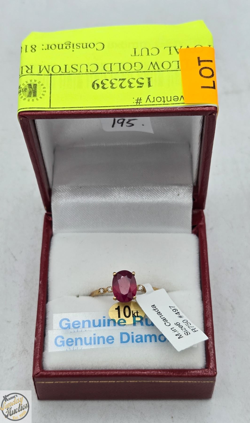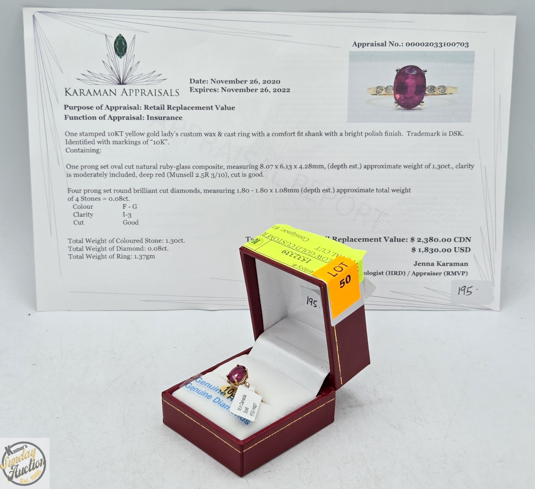 "NATURAL RUBY-GLASS COMPOSITE" STONE MEASURING 8.07 X 6.13 X 4.28MM WITH APPROXIMATE WEIGHT OF 1.30CT, MODERATELY INCLUDED, DEEP RED, CUT IS GOOD. ALONGSIDE FOUR PRONG SET BRILLIANT CUT DIAMONDS, 1.80-1.80 X 1.08MM, TOTAL DIAMOND APPROX 0.08CT, COLOR F-G, CLARITY I-3, CUT IS GOOD. COMES WITH APPRAISAL FROM KARAMAN APPRAISALS ESTIMATED REPLACEMENT VALUE $2,380.00 **ALL ITEMS MUST BE REMOVED BY 5PM SATURDAY, JULY 5TH 2025. ALL REMAINING ITEMS WILL BE SUBJECT TO A $6.00 PER DAY STORAGE CHARGE. ANY ITEMS REMAINING AFTER MONDAY, JULY 21ST 2025 WILL BE CONSIDERED FORFEITED. NO REFUNDS WILL BE ISSUED FOR FORFEITED ITEMS. TO SCHEDULE A PICK UP APPOINTMENT CLICK HERE