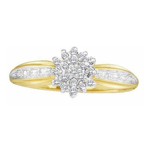 10KT Yellow Gold 0.10CTW DIAMOND LADIES CLUSTER RING **|**|** Source: 10224 ; Metal: Gold ; Metal Purity: 10KT ; Ring Size: 7 ; Main Stone: I1-I2 ; Total Carat: 0.1 ; Main Stone Color: H-I Color ; All diamonds are natural but colored diamonds are enhanced.
