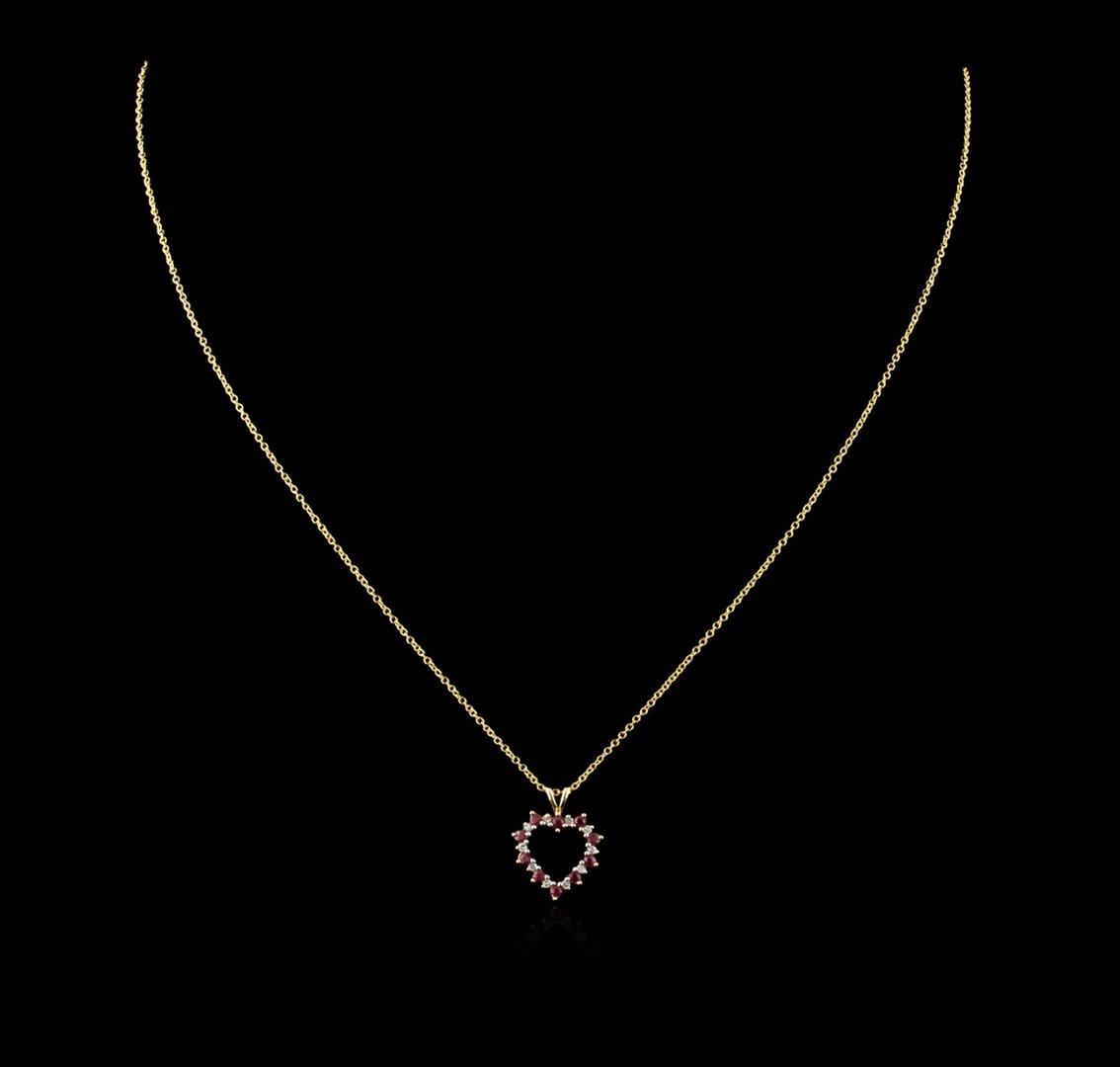 One pendant with chain featuring: 10KT white gold weighing 1.60 grams containing rubies with a total weight of 0.10ct and prong set round diamonds with a total weight of 0.05ct.