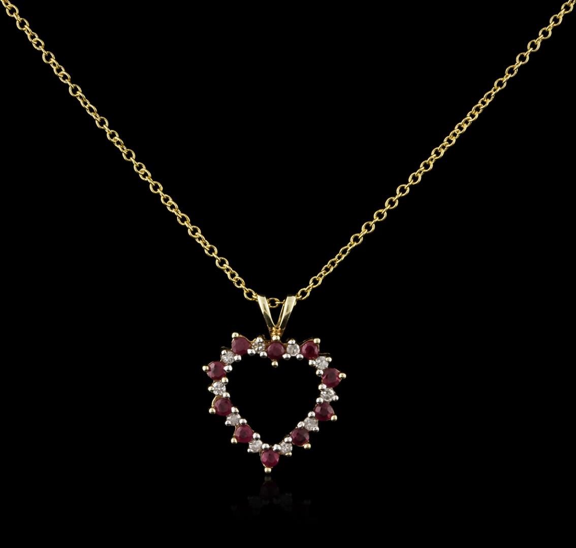One pendant with chain featuring: 10KT white gold weighing 1.60 grams containing rubies with a total weight of 0.10ct and prong set round diamonds with a total weight of 0.05ct.