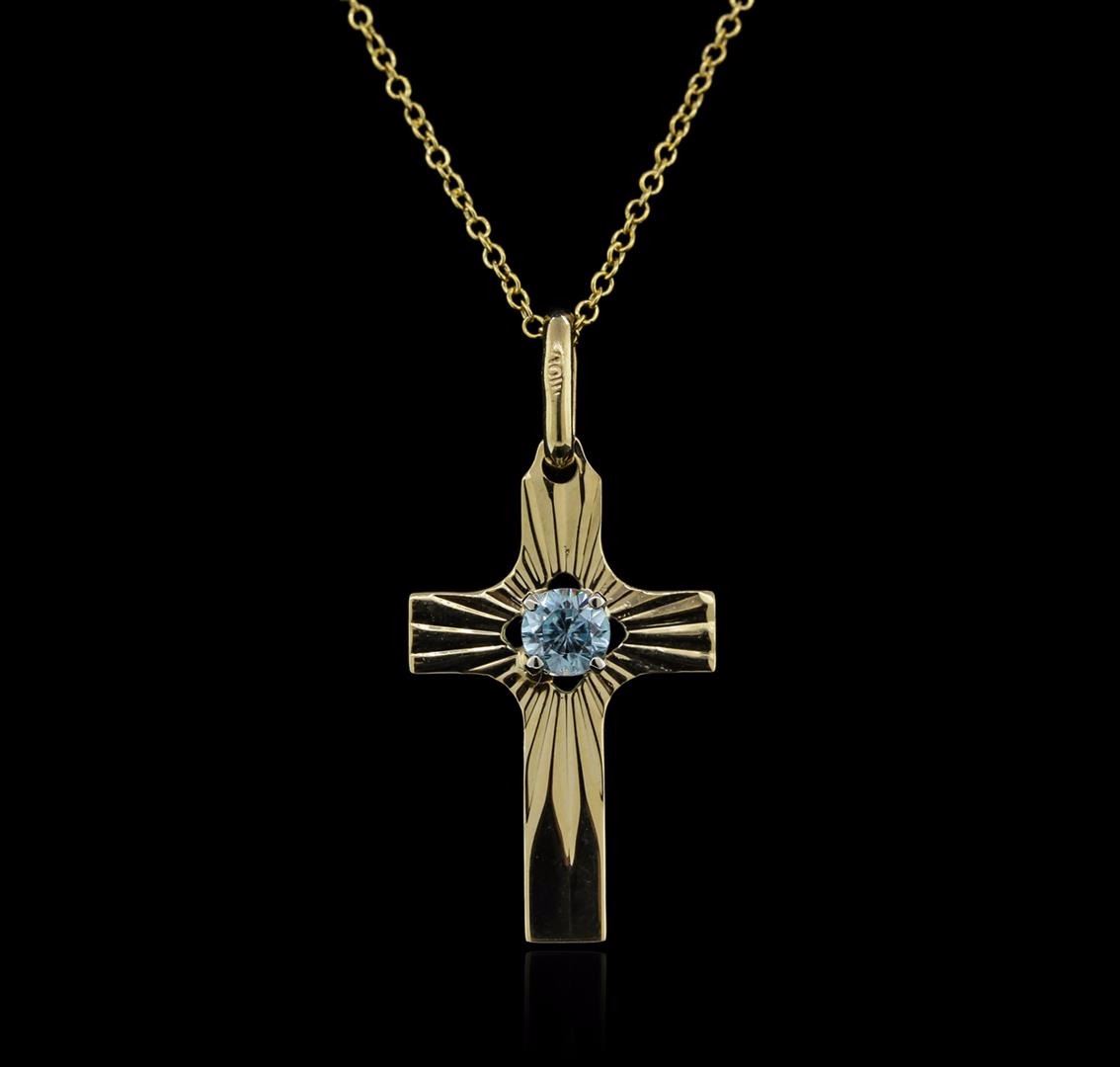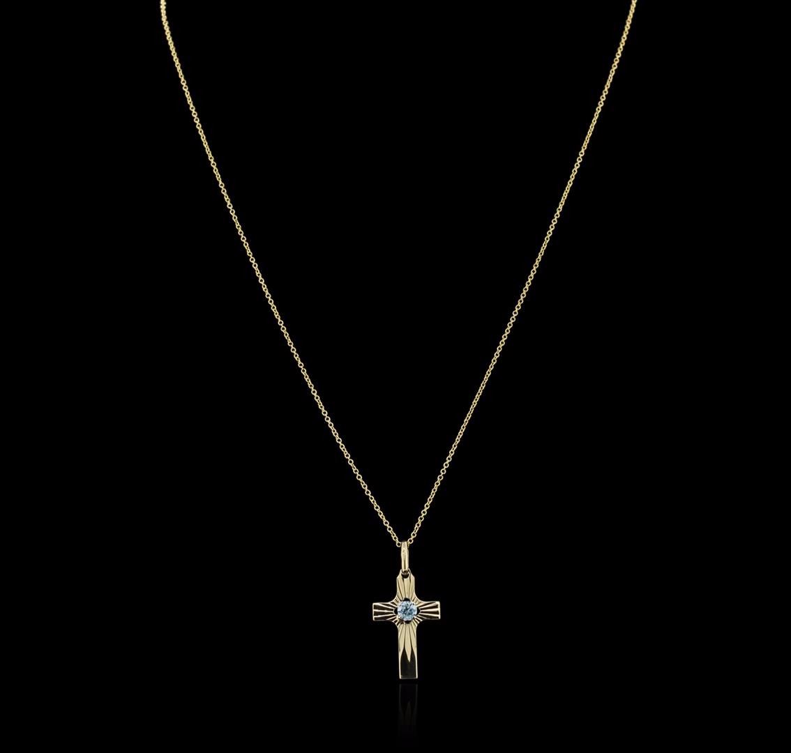 One cross pendant with chain featuring: 10KT yellow gold weighing 2.27 grams containing one aquamarine center stone with a total weight of 0.20ct.