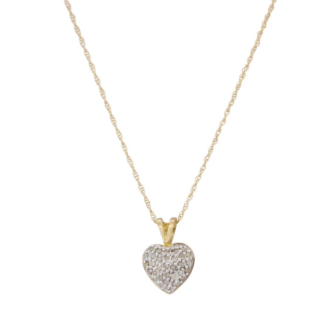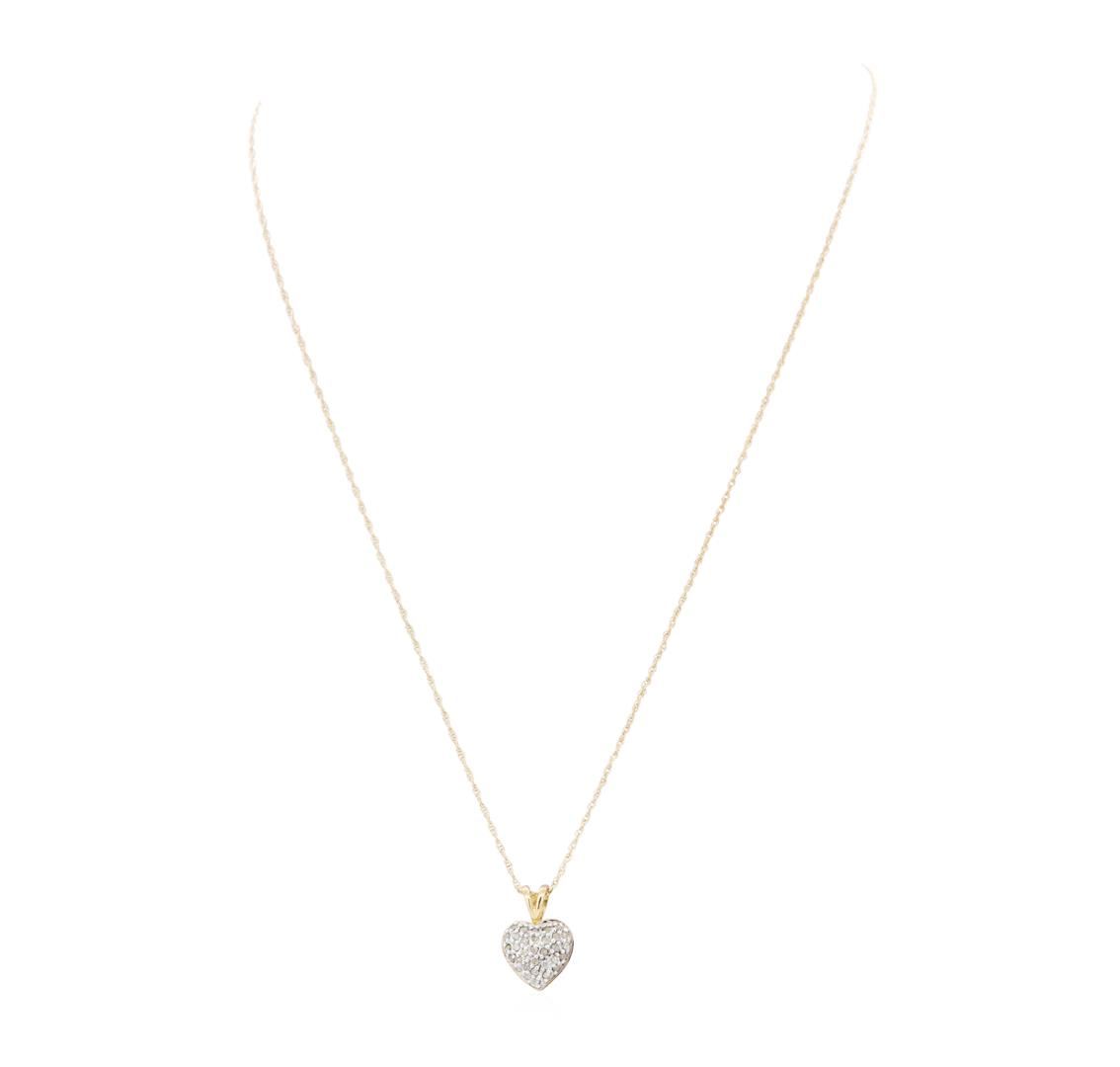 One heart shaped pendant with an eighteen inch loose rope chain featuring: 10KT yellow gold weighing 1.8 grams containing diamonds weighing 0.25ctw.