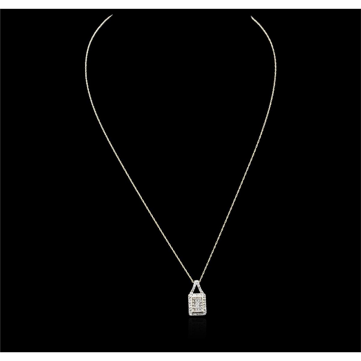 One square shaped pendant with chain featuring: 10KT yellow gold weighing 1.40 grams containing prong set round cut diamonds with a total weight of 0.25cts.