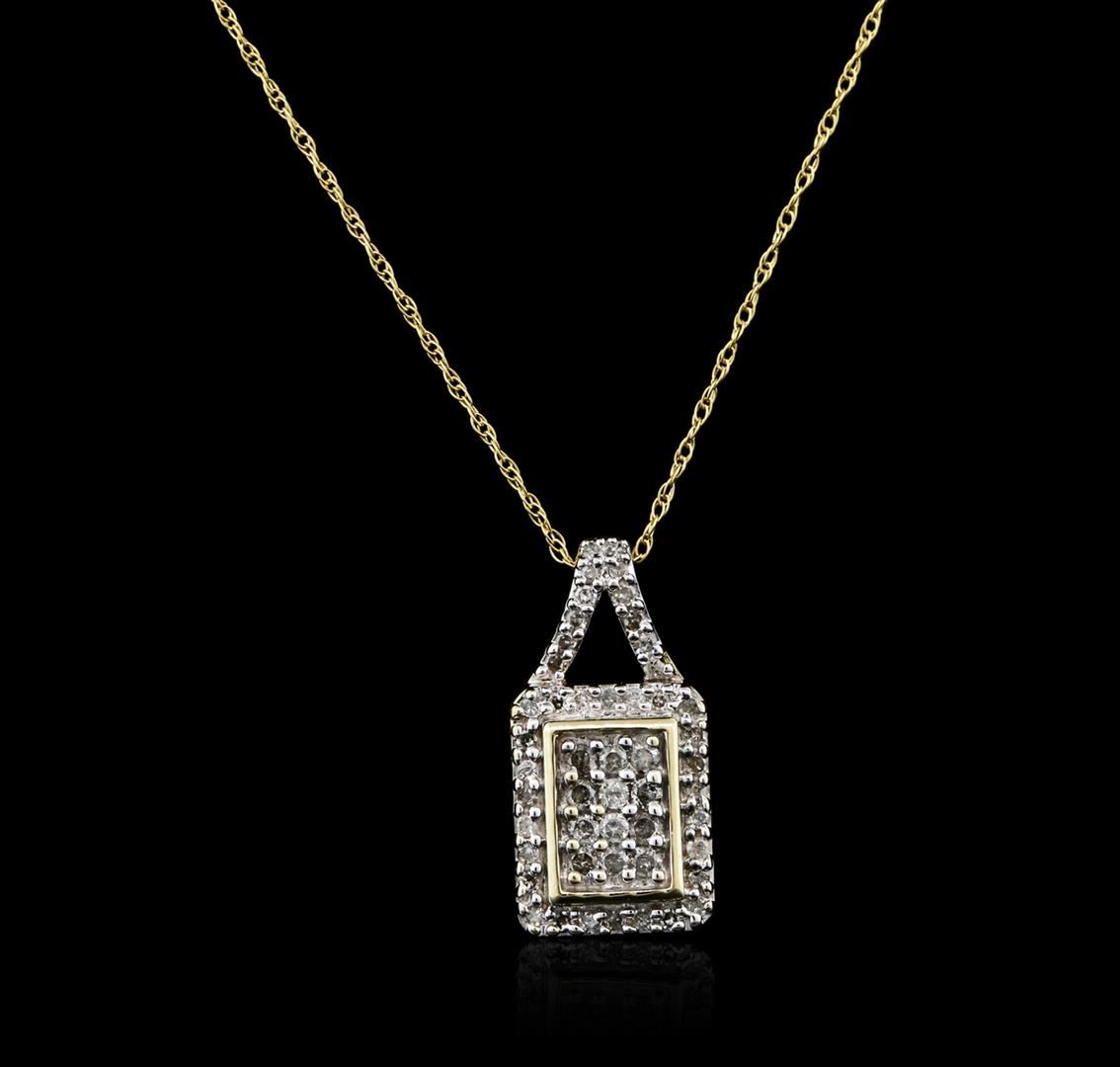 One square shaped pendant with chain featuring: 10KT yellow gold weighing 1.40 grams containing prong set round cut diamonds with a total weight of 0.25cts.