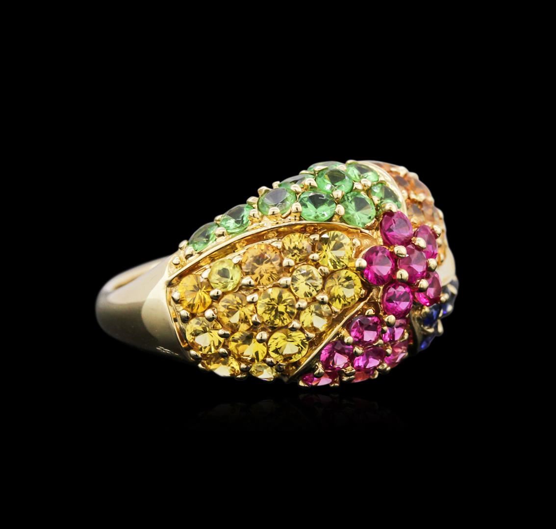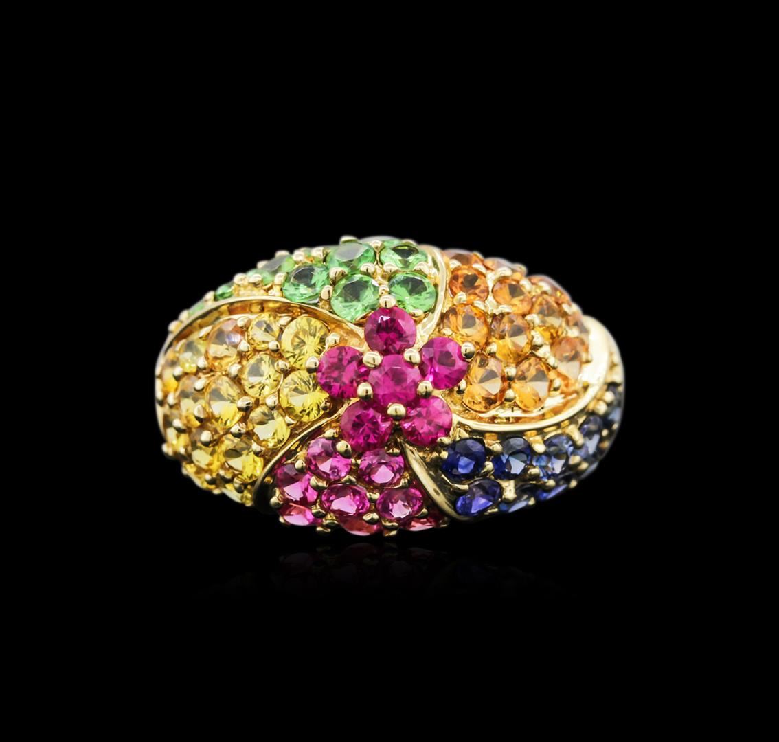 One ring featuring: 10KT yellow gold weighing 3.53 grams containing six hot pink rubies with a total weight of 0.46ct, eight pink sapphires with a total weight of 0.44ct, ten tsavorites with a total weight of 0.56ct, 13 orange sapphires with a total weight of 0.88ct, nine blue sapphires with a total weight of 0.55ct and 15 yellow sapphires with a total weight of 0.97ct.