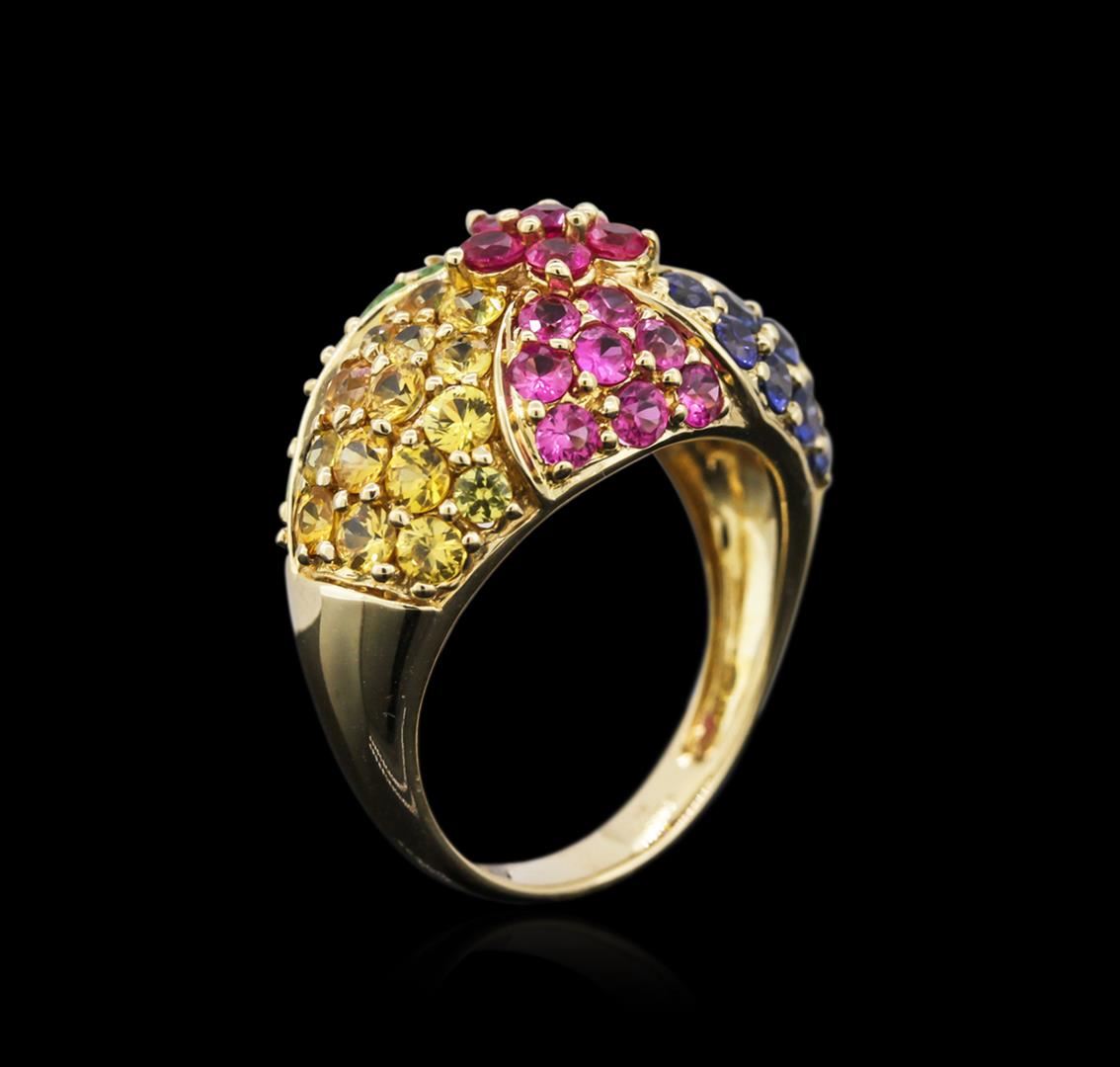 One ring featuring: 10KT yellow gold weighing 3.53 grams containing six hot pink rubies with a total weight of 0.46ct, eight pink sapphires with a total weight of 0.44ct, ten tsavorites with a total weight of 0.56ct, 13 orange sapphires with a total weight of 0.88ct, nine blue sapphires with a total weight of 0.55ct and 15 yellow sapphires with a total weight of 0.97ct.