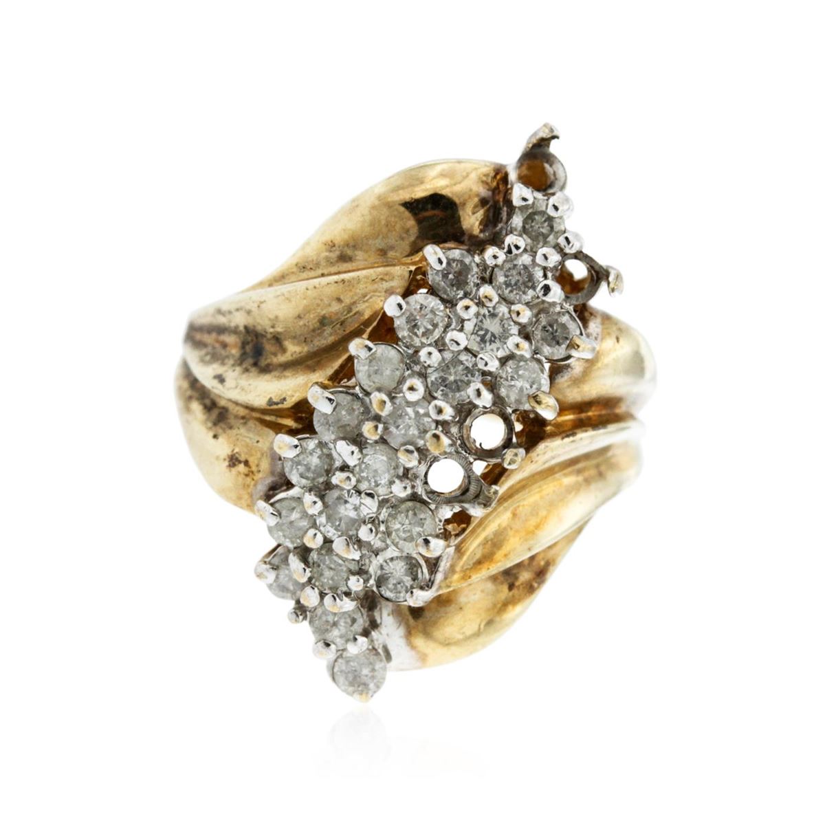 One electronically tested 10KT yellow gold ladies cast diamond ring. The ring features a cascading diamond cluster supported by scalloped shoulders, completed by a two millimeter wide band. Bright polish finish with rhodium accents. Identified with markings of "10K". Condition is good. Containing: Twenty-Five prong set round brilliant cut diamonds, measuring 2.20 - 2.00 x 1.26mm (depth est.) approximate total weight of 25 Stones = 0.95ct. Graded in the setting. Clarity: I-2 to I-3. Color: I - K. Total Weight of Diamonds 0.95ct. Total Weight of Ring 6.45 grams. AIG Appraised.