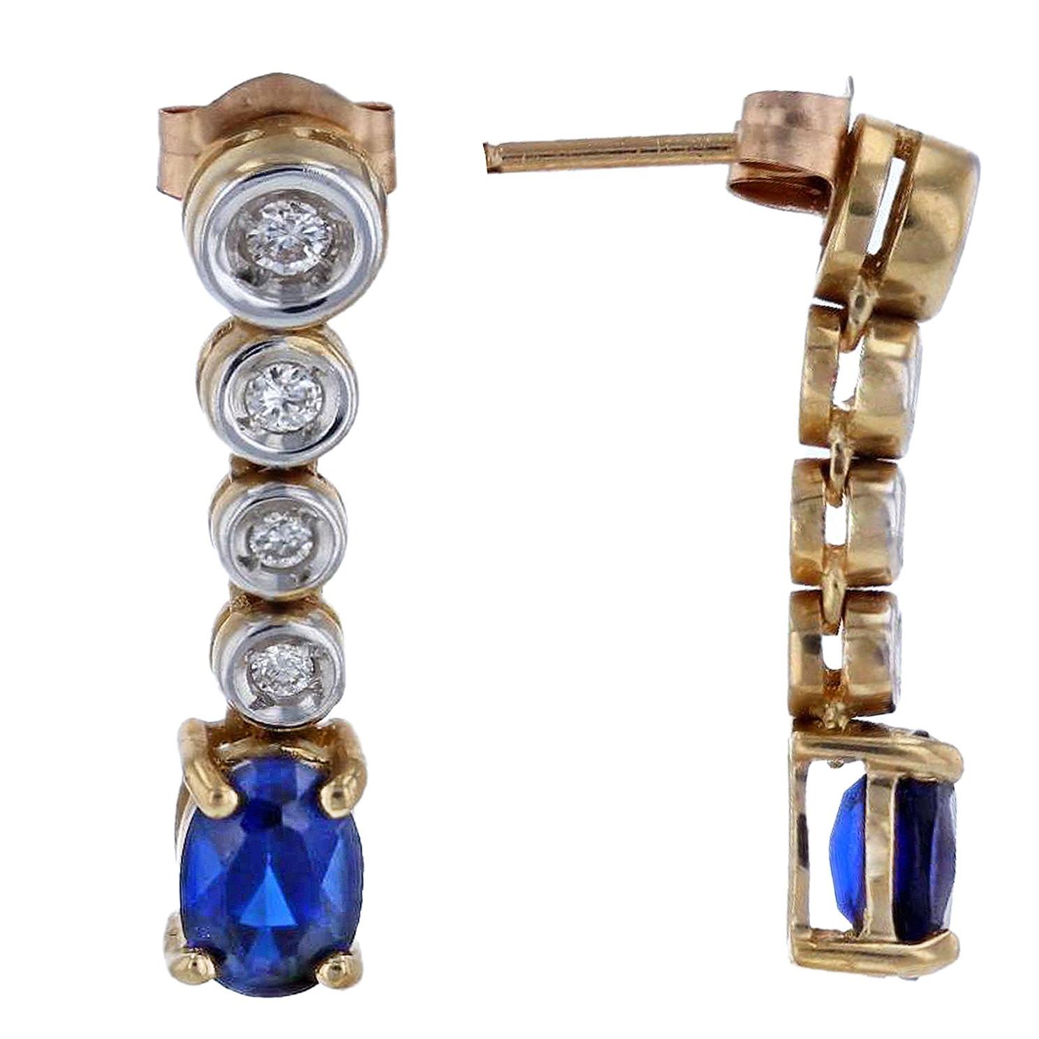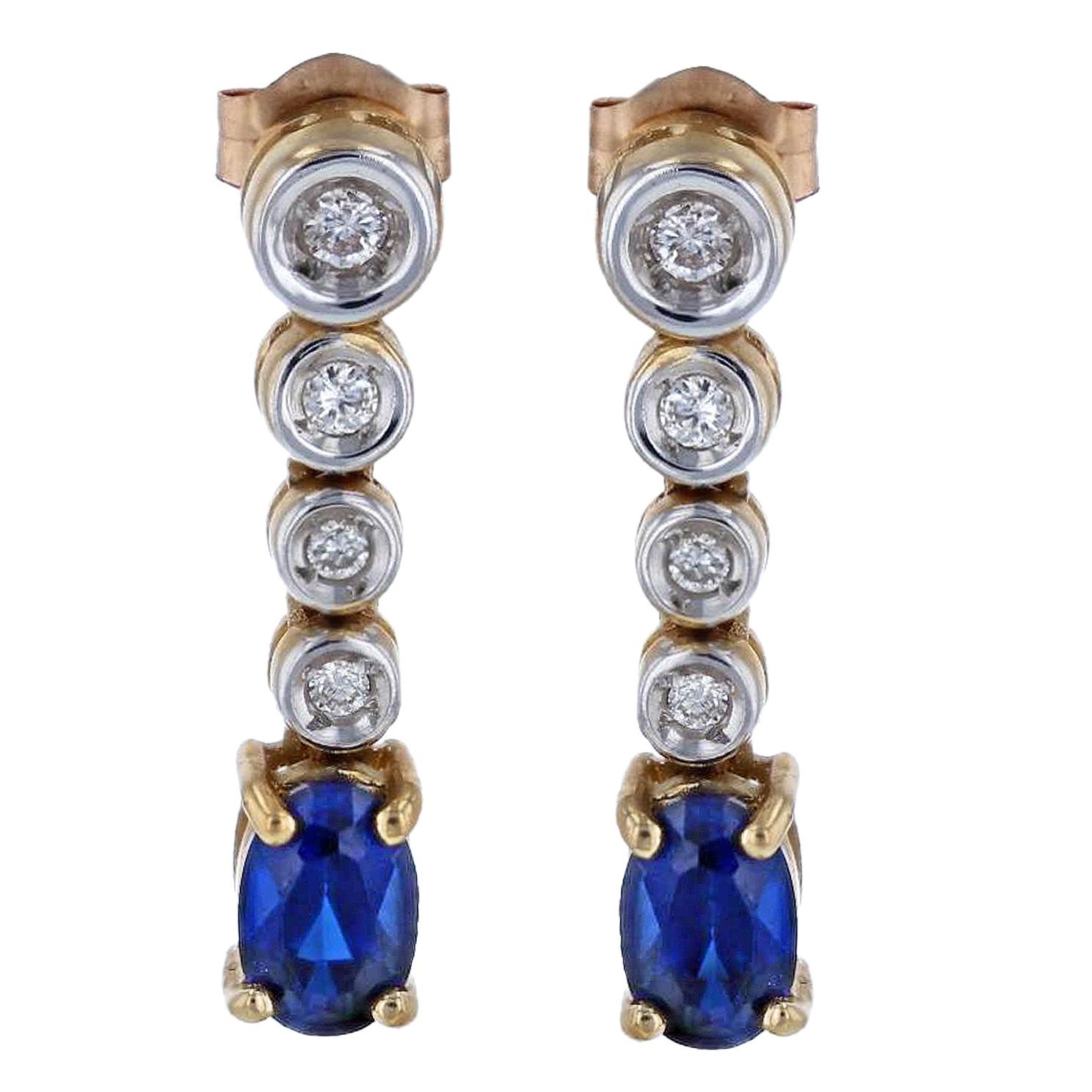 One 10KT Yellow Gold 1.12ctw Blue Sapphire and Diamond Earrings. One pair electronically tested 10KT yellow gold ladies cast & assembled sapphire & diamond dangle earrings. Each earring features a drop consisting of an oval shape sapphire, supported by individually set solitaire diamonds, completed by a diamond set post and standard backings. Bright polish finish with rhodium accents. Trademark is LGL. Identified with markings of "10K". Condition is new, good workmanship. Containing: Two prong set oval mixed cut natural blue sapphires, measuring 6.00 x 4.00 x 2.80mm, approximate total weight of 1.12ct., clarity is eye clean, type II, dark, moderately strong, violetish blue color, (GIA vB 7/4), cut is good. Transmitting light with no distortion, transparent. Measurements are an average for the pair. Graded in the setting. Eight bead set round brilliant cut diamonds, measuring 1.70 - 1.40 x 1.01mm (depth est.) approximate total weight of 8 Stones = 0.12ct. Graded in the setting. Clarity is SI-1 to I-1. Color of G - H. Total Weight of Colored Stones 1.12 ct. Total Weight of Diamonds 0.12 ct. Total Weight of Dangle Earrings 2.20 gm.