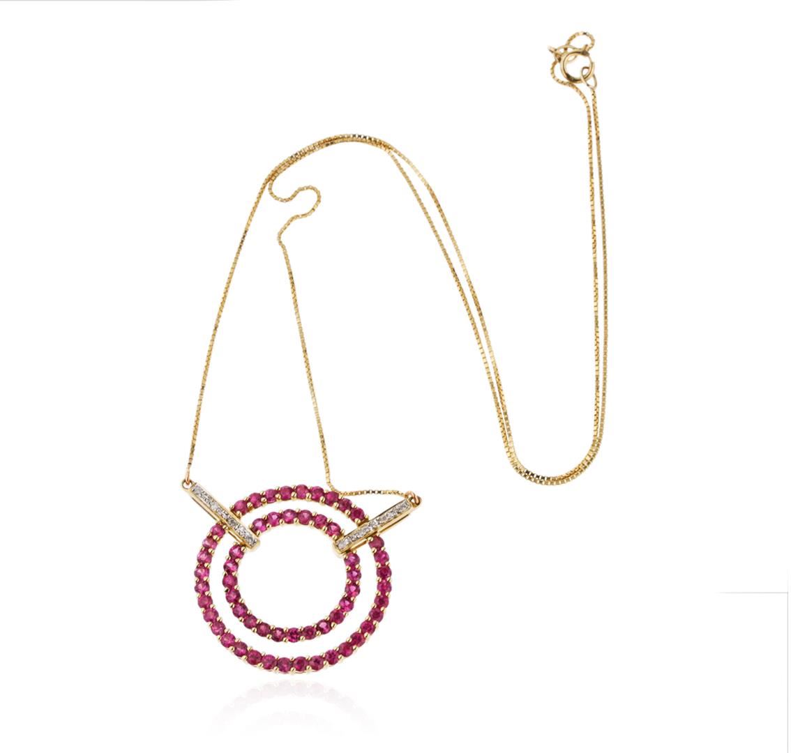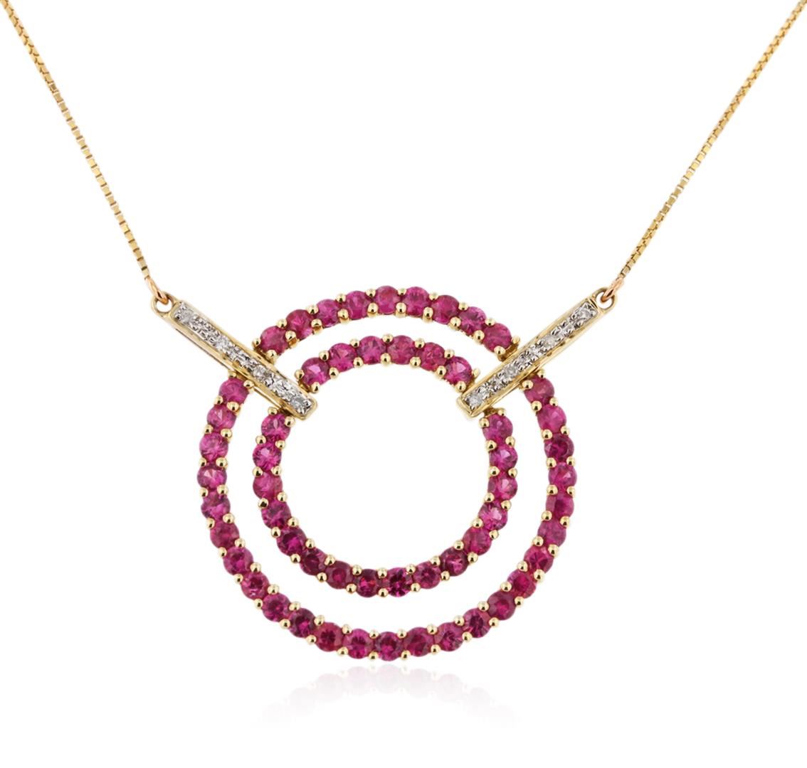 One pendant with chain featuring: 10KT yellow gold weighing 4.73 grams containing 56 hot pink rubies with a total weight of 2.43ct and eight round diamonds with a total weight of 0.05ct.