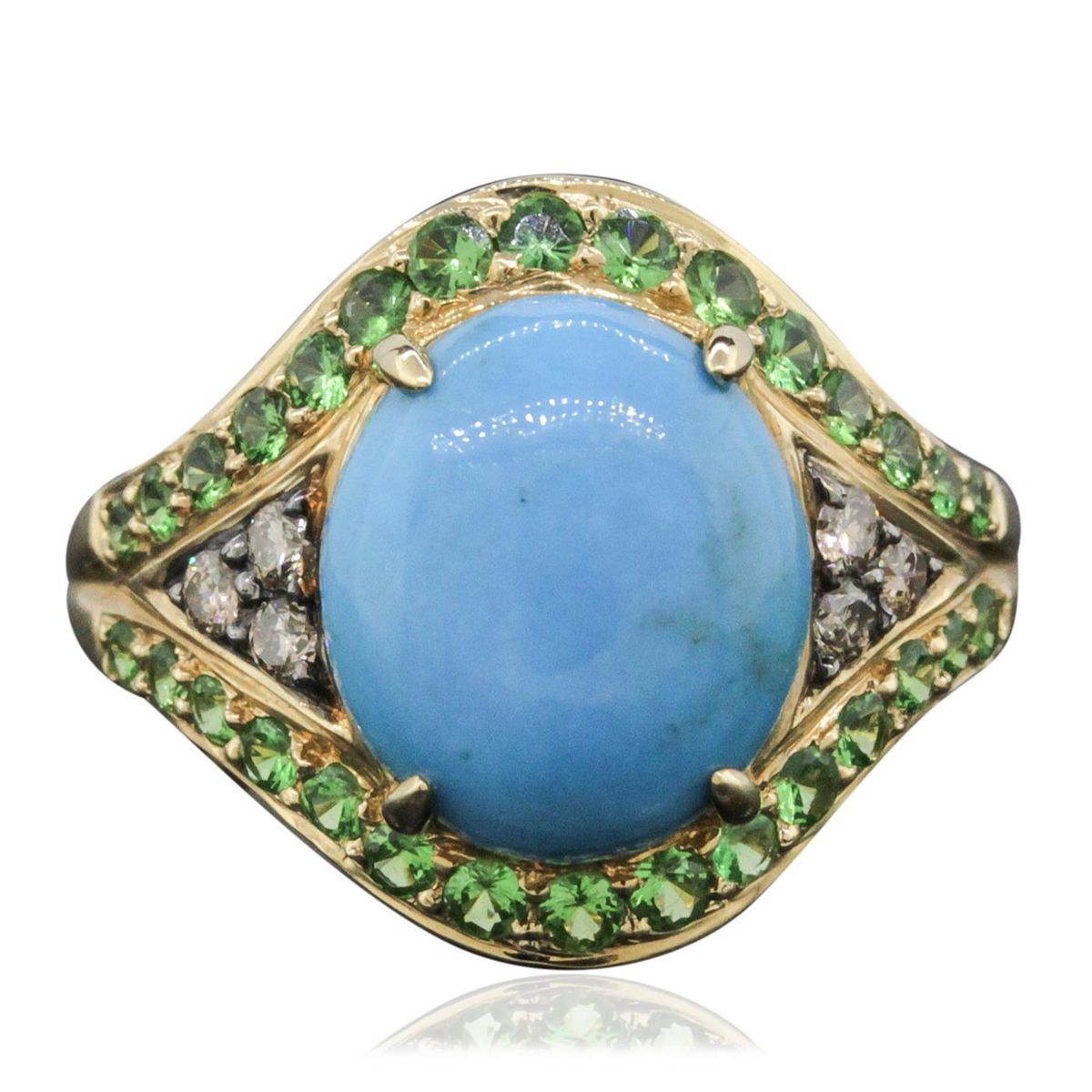 One ring featuring: 10KT yellow gold weighing 2.87 grams containing one turquoise with a total weight of 3.36ct, 30 tsavorites with a total weight of 0.63cts, and 6 round cut diamonds with a total weight of 0.15cts.