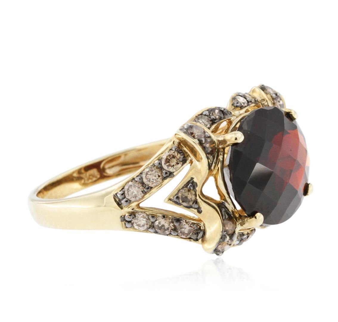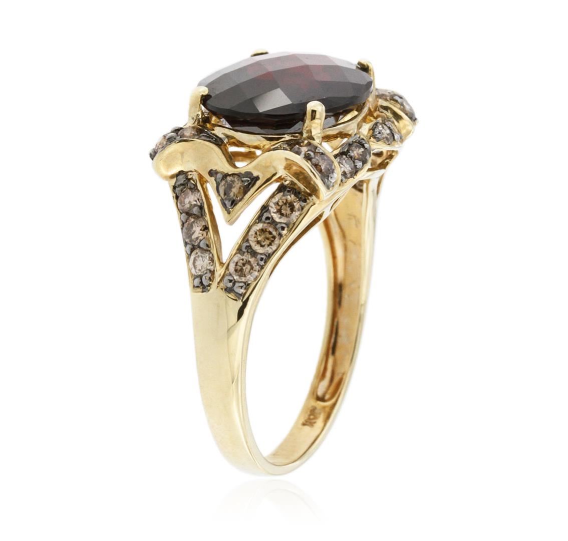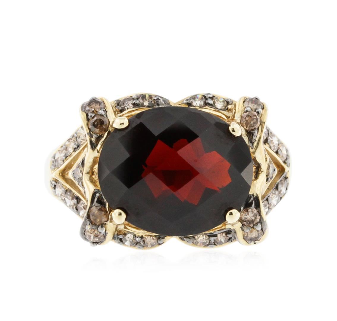 One ring featuring: 10KT yellow gold weighing 2.70 grams containing one garnet with a total weight of 4.91ct and 30 round diamonds with a total weight of 0.60ct.