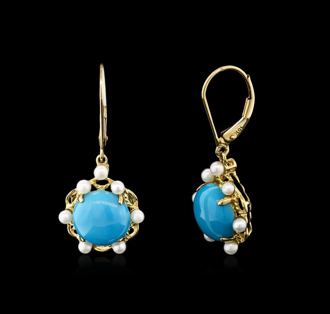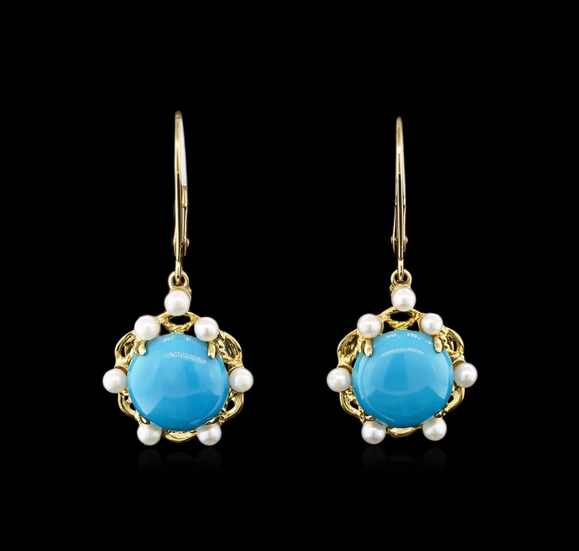 One pair of earrings featuring: 10KT yellow gold weighing 2.46 grams containing two turquoise with a total weight of 5.55ct and 14 pearls with a total weight of 1.45ct.