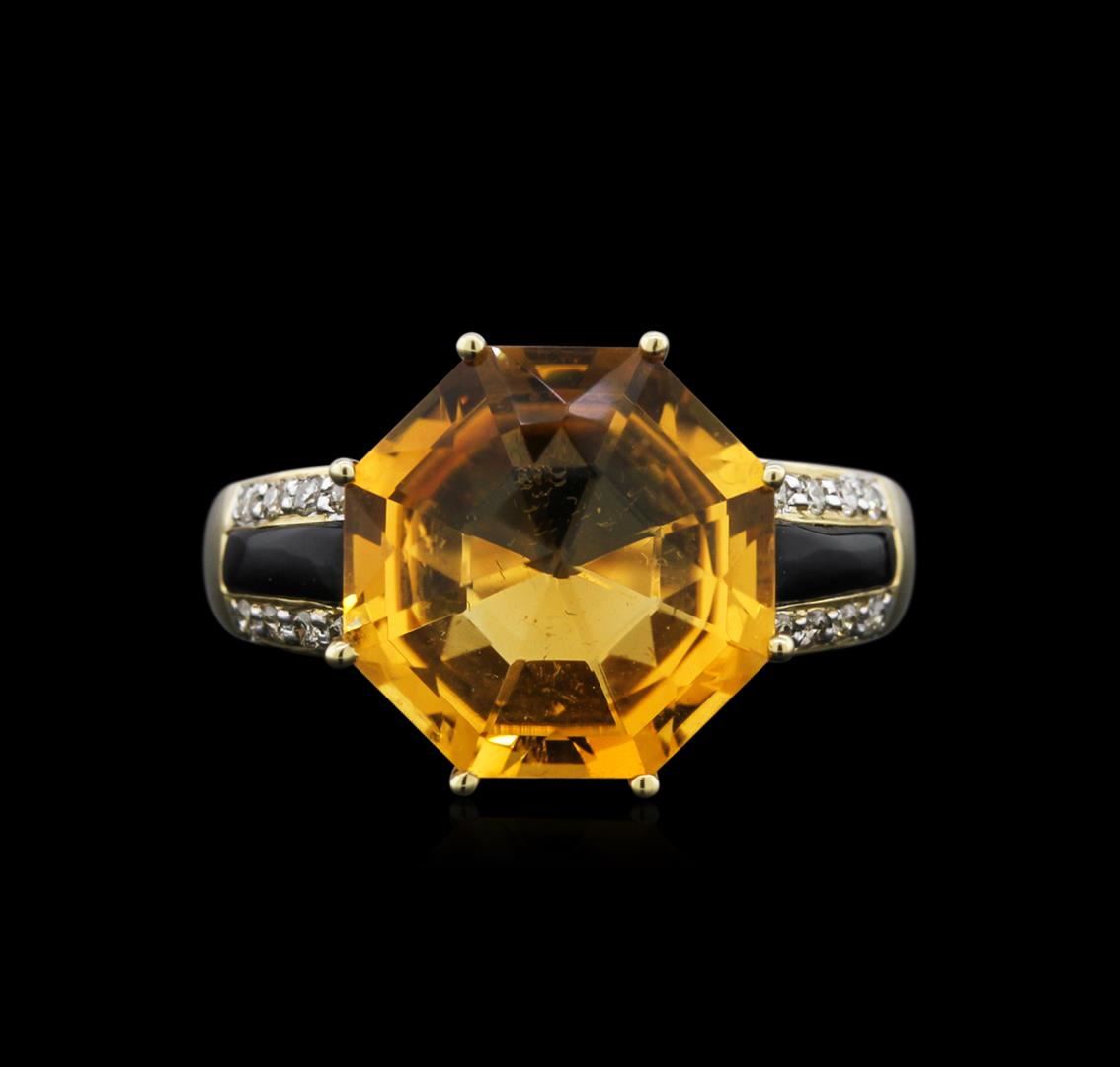 One ring featuring: 10KT yellow gold weighing 2.24 grams containing one citrine center stone with a total weight of 5.80ct, two onyxs with a total weight of 0.31ct and 16 round diamonds with a total weight of 0.12ct.