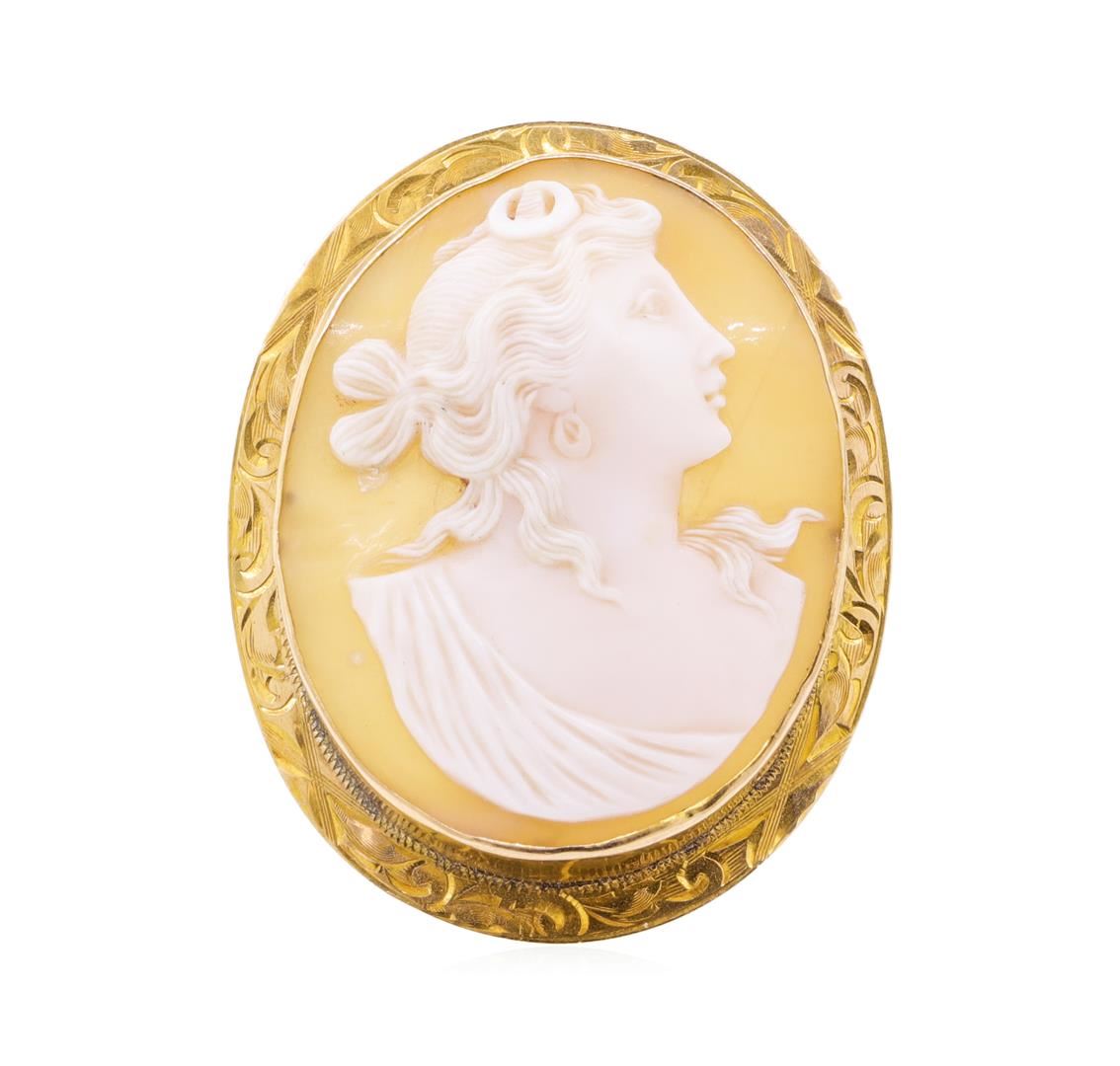One cameo pin featuring: 10KT yellow gold weighing 10.0 grams. The pin measures 53 by 41.5 millimeters and contains a maiden's profile cameo carved from a conch shell.
