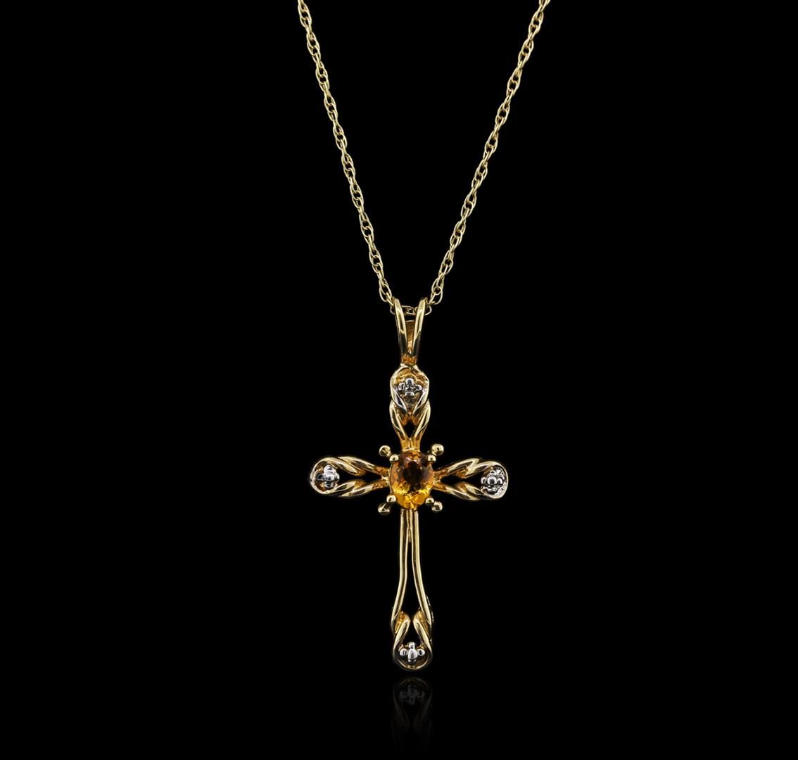 One 10KT yellow gold citrine and diamond cross pendant with chain weighing 1.60 grams.