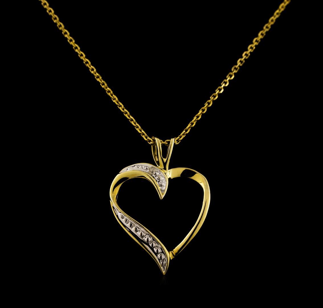 One heart pendant with chain featuring: 10KT yellow gold weighing 1.50 grams containing one diamond with a total weight of 0.01ct. The chain measures 18" in length.