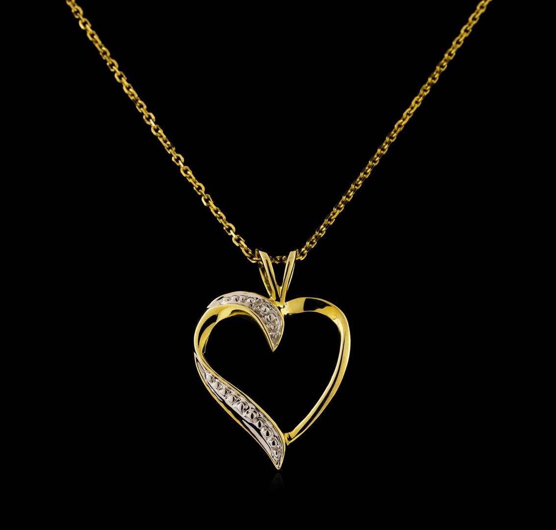 One heart pendant with chain featuring: 10KT yellow gold weighing 1.50 grams containing one diamond with a total weight of 0.01ct. The chain measures 18" in length.