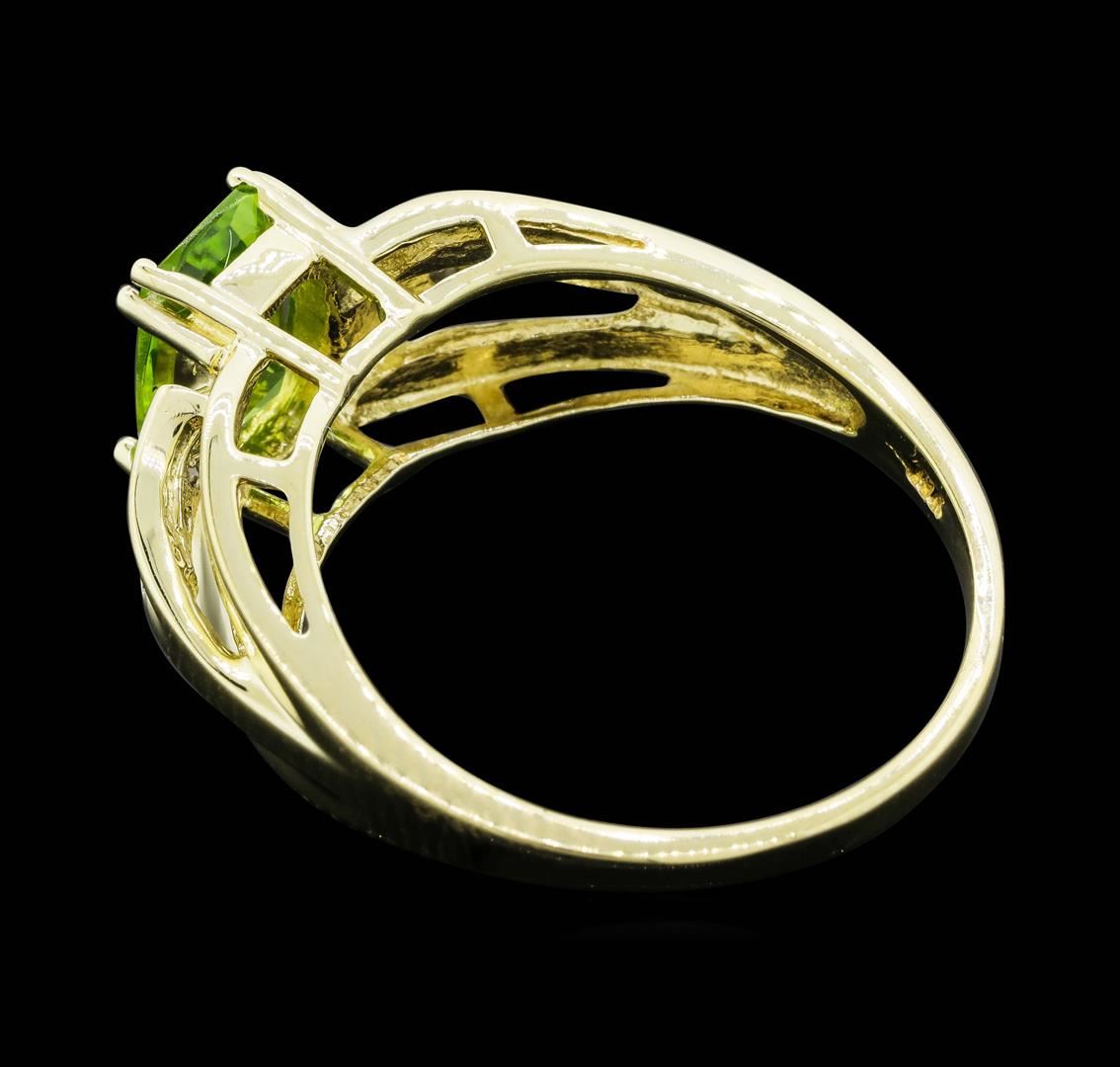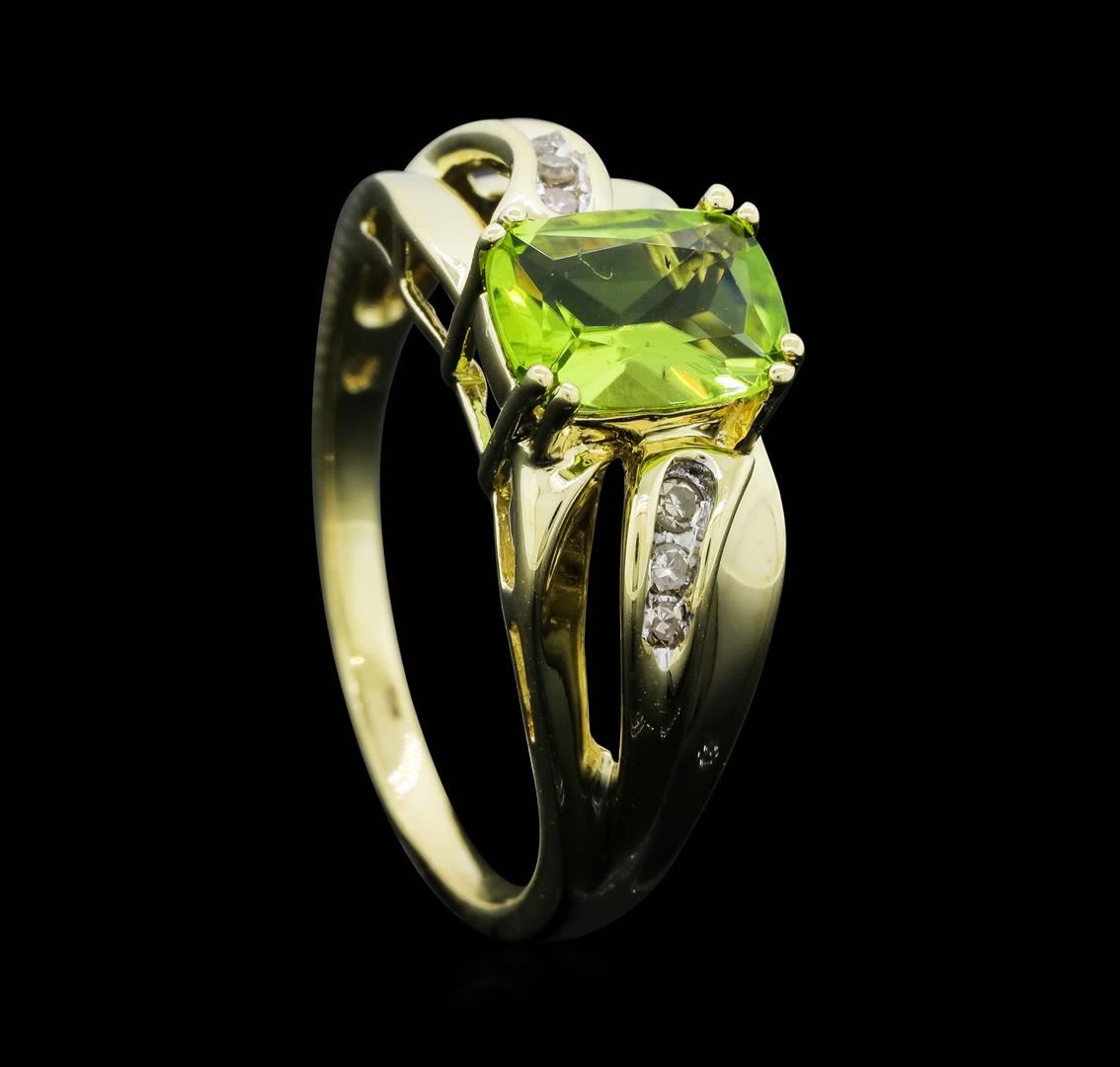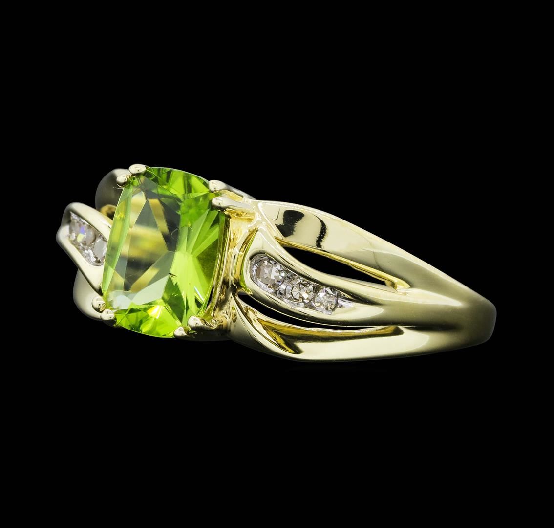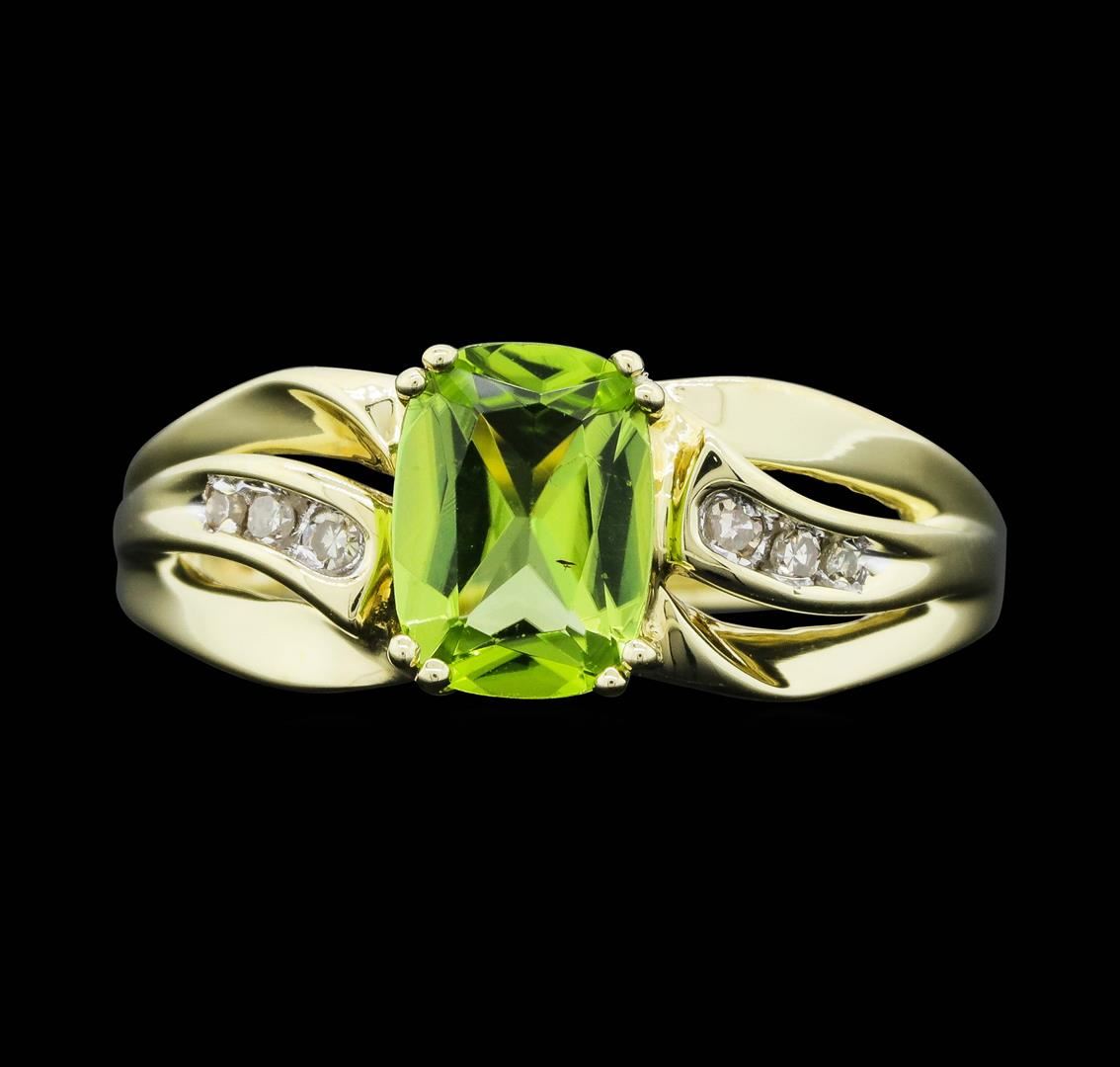 One Ladies ring featuring: 10KT yellow gold weighing 3.1 grams containing one peridot weighing 1.50ct and single cut diamonds weighing 0.08ctw. The ring is a size 7.
