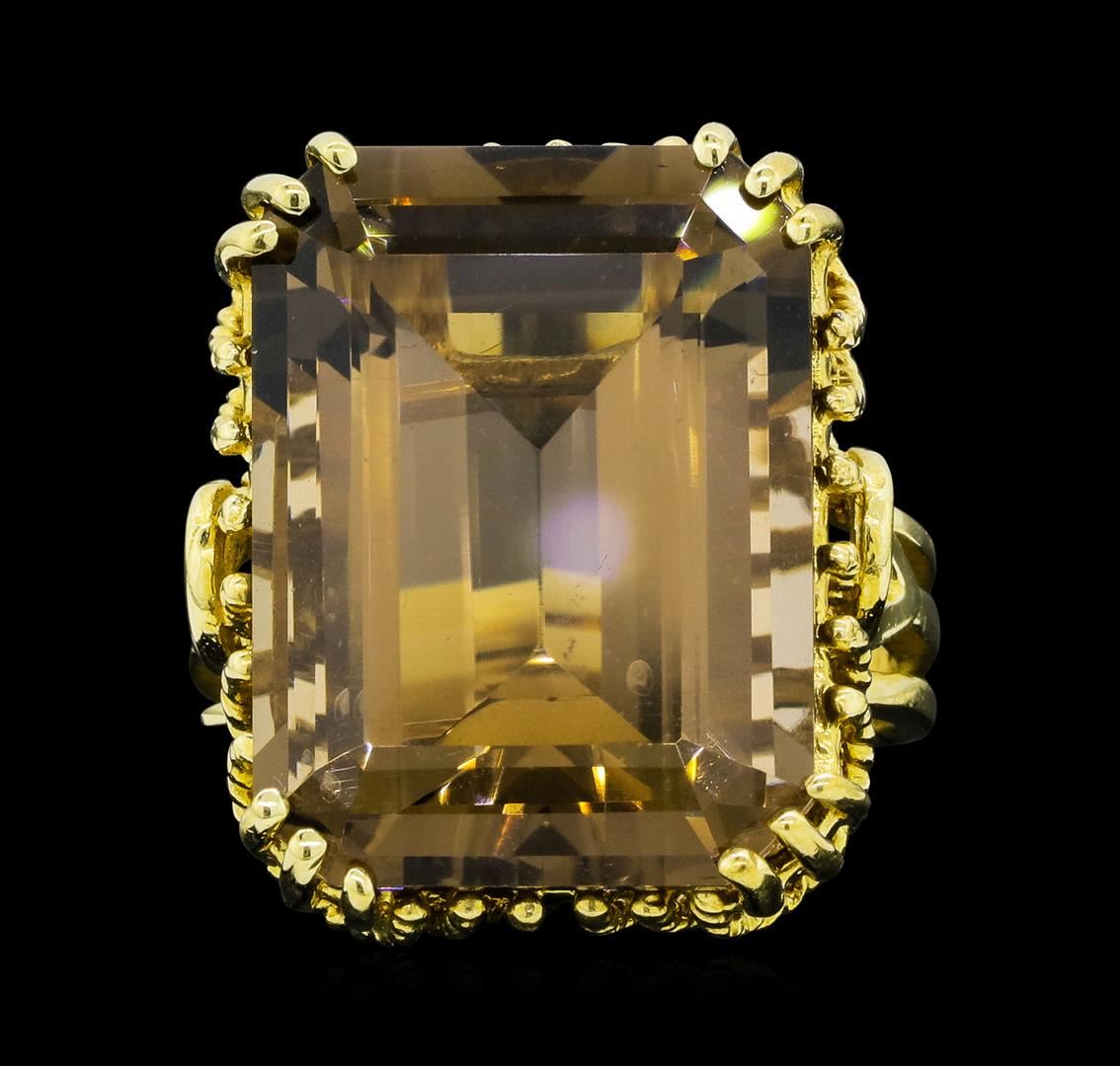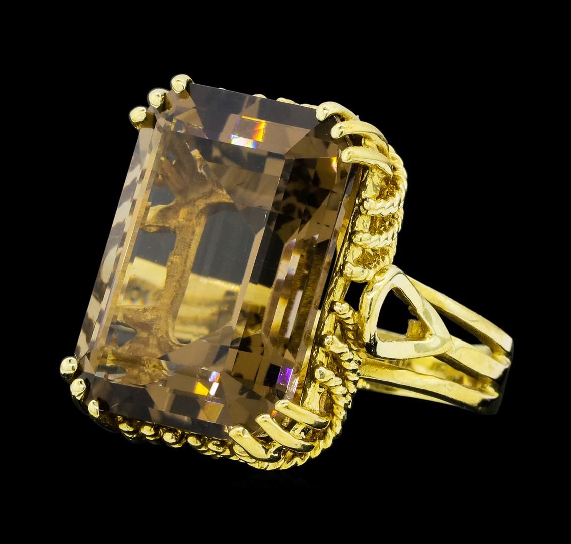 One lady's ring featuring: 10KT yellow gold weighing 10.2 grams containing one emerald cut smoky quartz weighing 21.00ctw. The ring is a size 8.