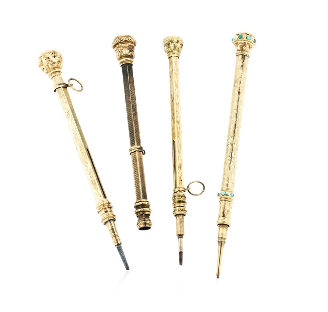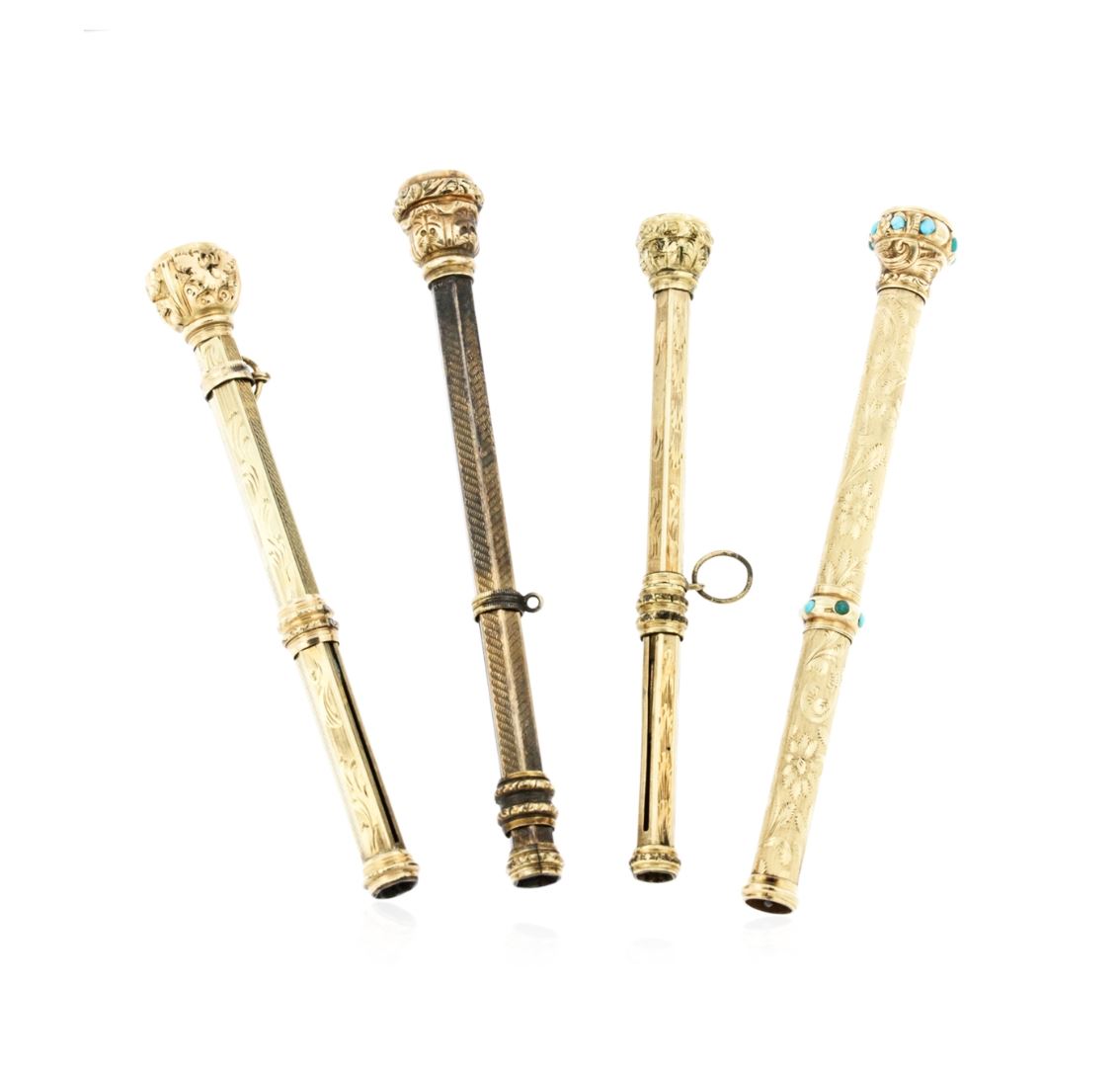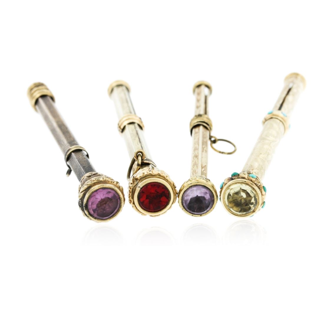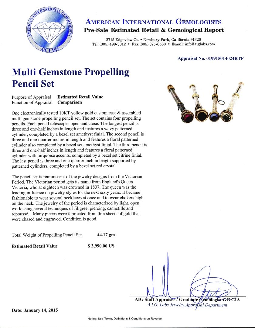 One electronically tested 10KT yellow gold custom cast & assembled multi gemstone propelling pencil set. The set contains four propelling pencils. Each pencil telescopes open and close. The longest pencil is three and one-half inches in length and features a wavy patterned cylinder, completed by a bezel set amethyst finial. The second pencil is three and one-quarter inches in length and features a floral patterned cylinder also completed by a bezel set amethyst finial. The third pencil is three and one-half inches in length and features a floral patterned cylinder with turquoise accents, completed by a bezel set citrine finial. The last pencil is three and one-quarter inch in length supported by patterned cylinders, completed by a bezel set red crystal. The pencil set is reminiscent of the jewelry designs from the Victorian Period. The Victorian period gets its name from England's Queen Victoria, who at eighteen was crowned in 1837. The queen was the leading influence on jewelry styles for the next sixty years. It became fashionable to wear several necklaces at once and to wear chokers high on the neck. The jewelry of the period is characterized by light, open work using several techniques of filigree, piercing, cannetille and repousse. Many pieces were fabricated from thin sheets of gold that were chased and engraved. Condition is good. Total Weight of Propelling Pencil Set 44.17 grams. AIG Appraised at $3,990.00.