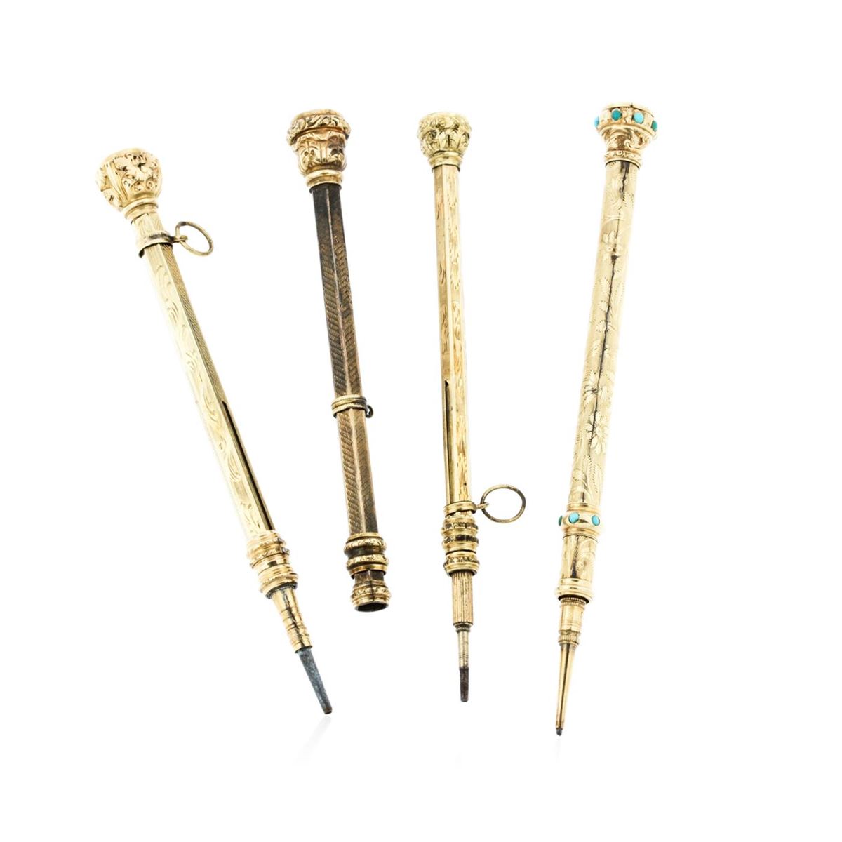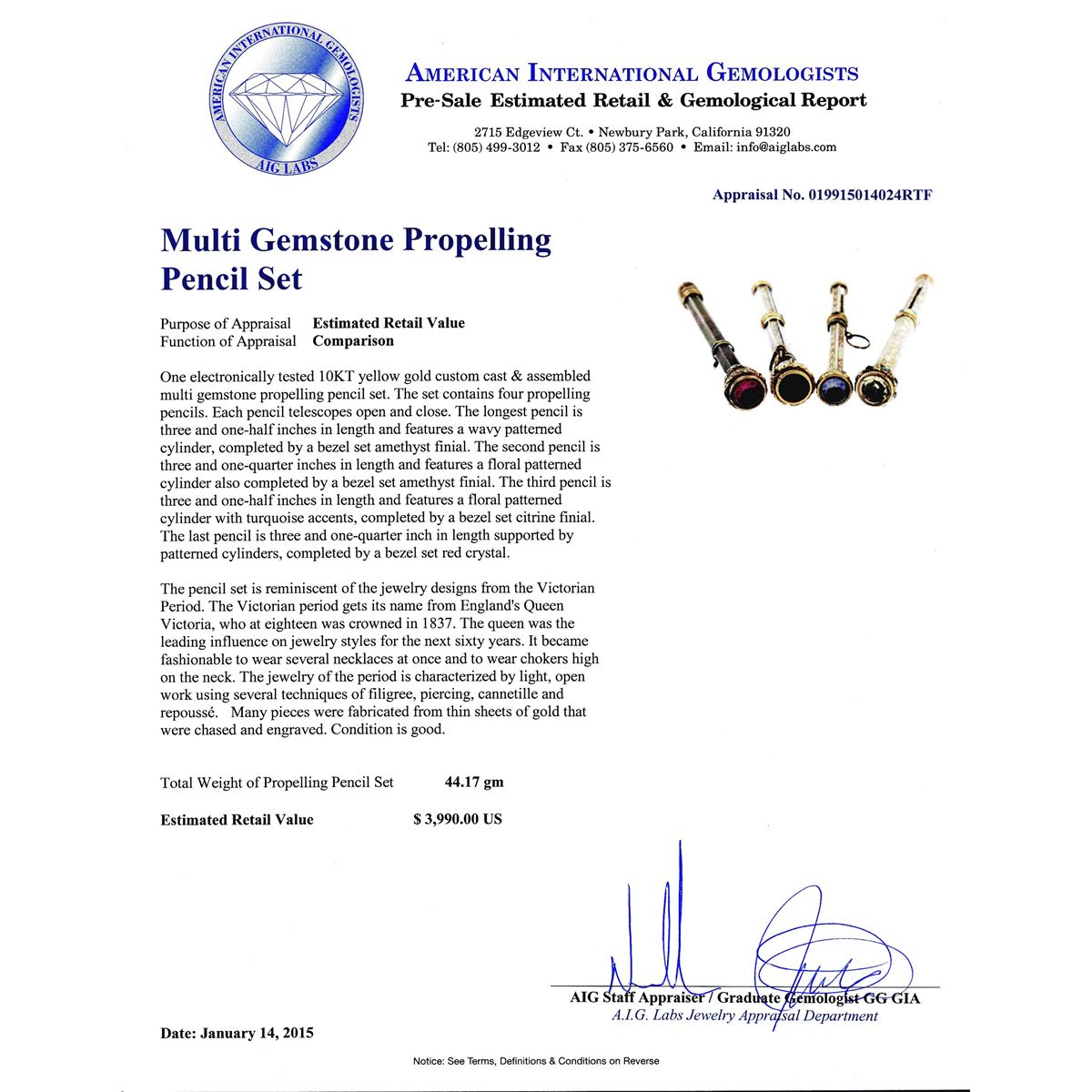 One electronically tested 10KT yellow gold custom cast & assembled multi gemstone propelling pencil set. The set contains four propelling pencils. Each pencil telescopes open and close. The longest pencil is three and one-half inches in length and features a wavy patterned cylinder, completed by a bezel set amethyst finial. The second pencil is three and one-quarter inches in length and features a floral patterned cylinder also completed by a bezel set amethyst finial. The third pencil is three and one-half inches in length and features a floral patterned cylinder with turquoise accents, completed by a bezel set citrine finial. The last pencil is three and one-quarter inch in length supported by patterned cylinders, completed by a bezel set red crystal. The pencil set is reminiscent of the jewelry designs from the Victorian Period. The Victorian period gets its name from England's Queen Victoria, who at eighteen was crowned in 1837. The queen was the leading influence on jewelry styles for the next sixty years. It became fashionable to wear several necklaces at once and to wear chokers high on the neck. The jewelry of the period is characterized by light, open work using several techniques of filigree, piercing, cannetille and repousse. Many pieces were fabricated from thin sheets of gold that were chased and engraved. Condition is good. Total Weight of Propelling Pencil Set 44.17 grams. AIG Appraised at $3,990.00.