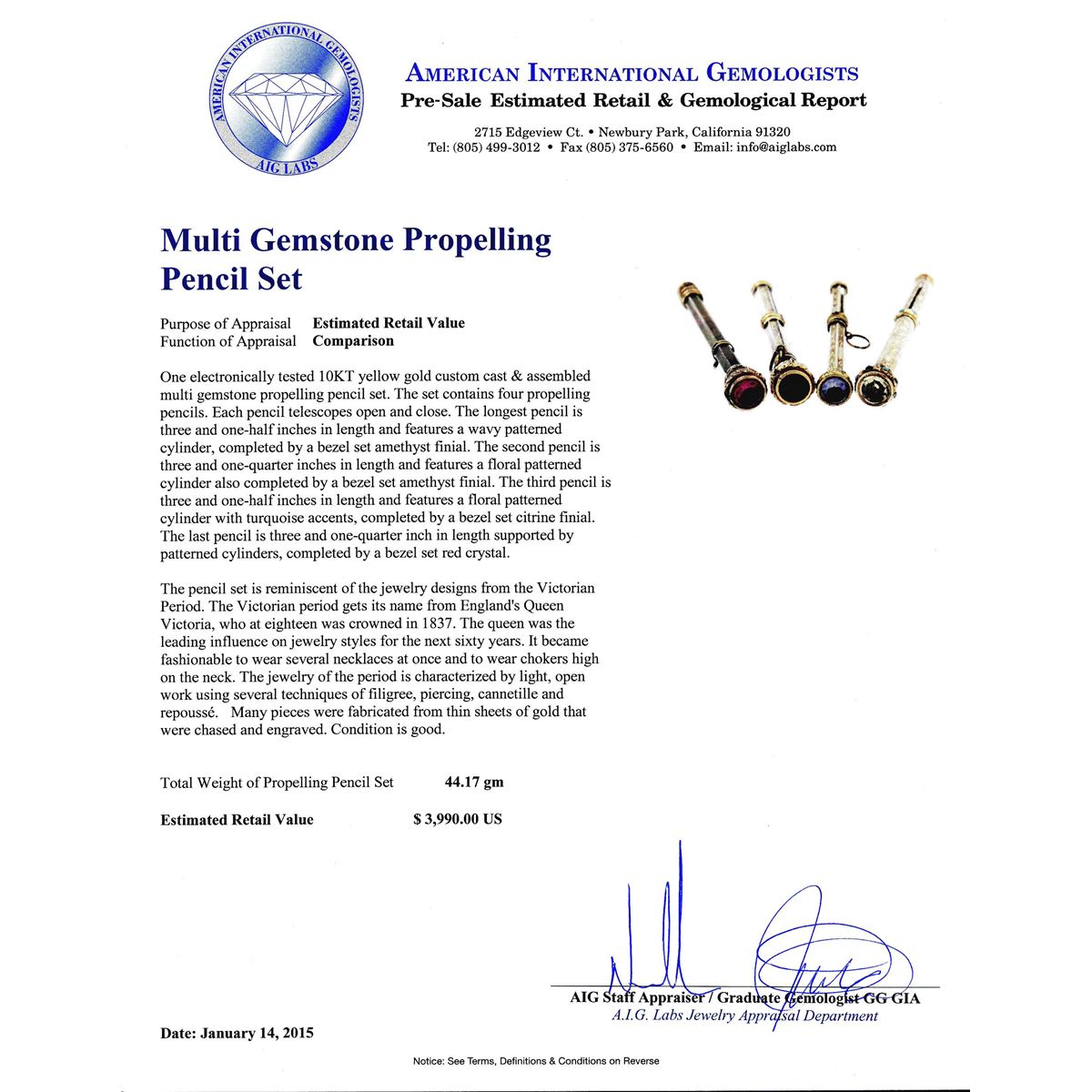 One electronically tested 10KT yellow gold custom cast & assembled multi gemstone propelling pencil set. The set contains four propelling pencils. Each pencil telescopes open and close. The longest pencil is three and one-half inches in length and features a wavy patterned cylinder, completed by a bezel set amethyst finial. The second pencil is three and one-quarter inches in length and features a floral patterned cylinder also completed by a bezel set amethyst finial. The third pencil is three and one-half inches in length and features a floral patterned cylinder with turquoise accents, completed by a bezel set citrine finial. The last pencil is three and one-quarter inch in length supported by patterned cylinders, completed by a bezel set red crystal. The pencil set is reminiscent of the jewelry designs from the Victorian Period. The Victorian period gets its name from England's Queen Victoria, who at eighteen was crowned in 1837. The queen was the leading influence on jewelry styles for the next sixty years. It became fashionable to wear several necklaces at once and to wear chokers high on the neck. The jewelry of the period is characterized by light, open work using several techniques of filigree, piercing, cannetille and repousse. Many pieces were fabricated from thin sheets of gold that were chased and engraved. Condition is good. Total Weight of Propelling Pencil Set 44.17 grams. AIG Appraised at $3,990.00.