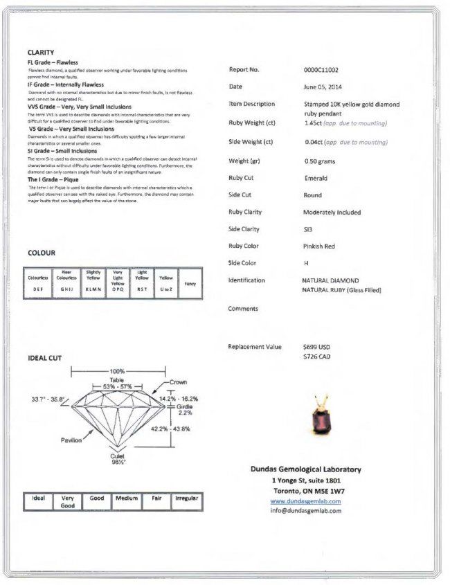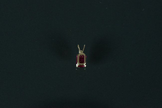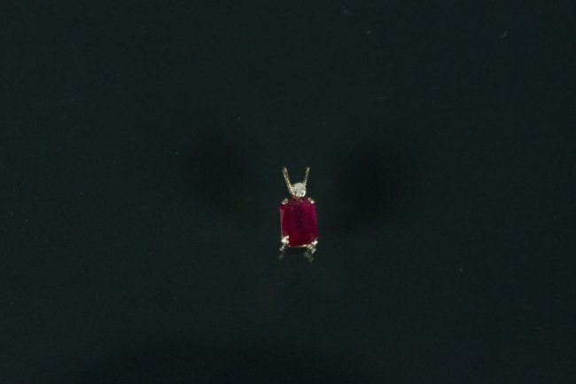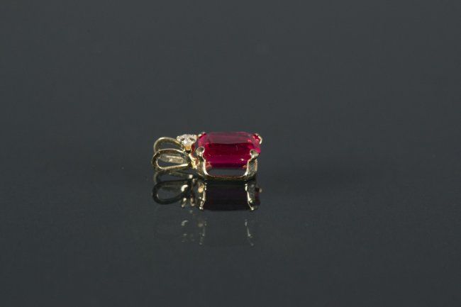 10KT. Yellow Gold Pendant with Ruby; natural ruby and natural diamond; replacement value: $726; accompanied with Certificate; H: 7.18 mm, W: 5.13 mm, 0.5 grams