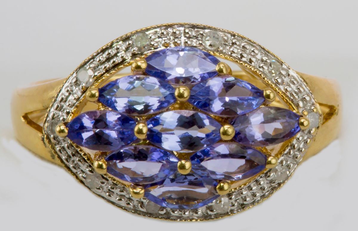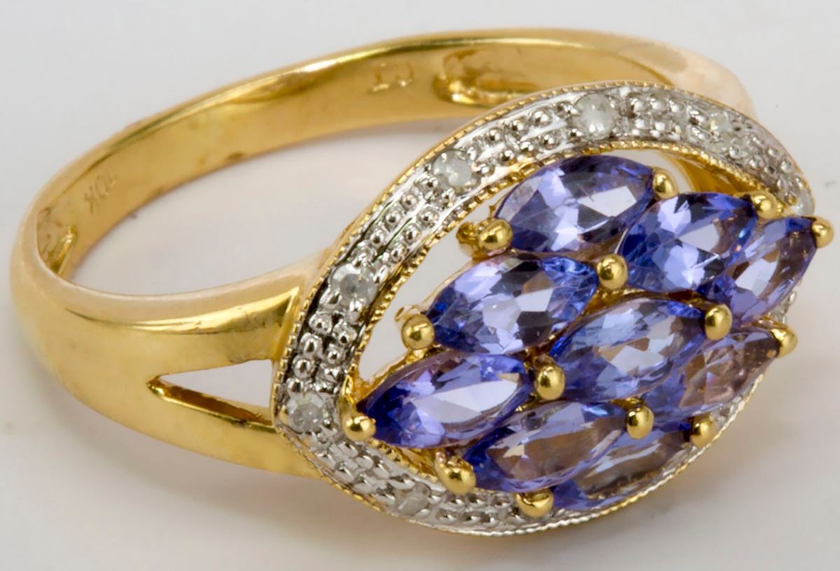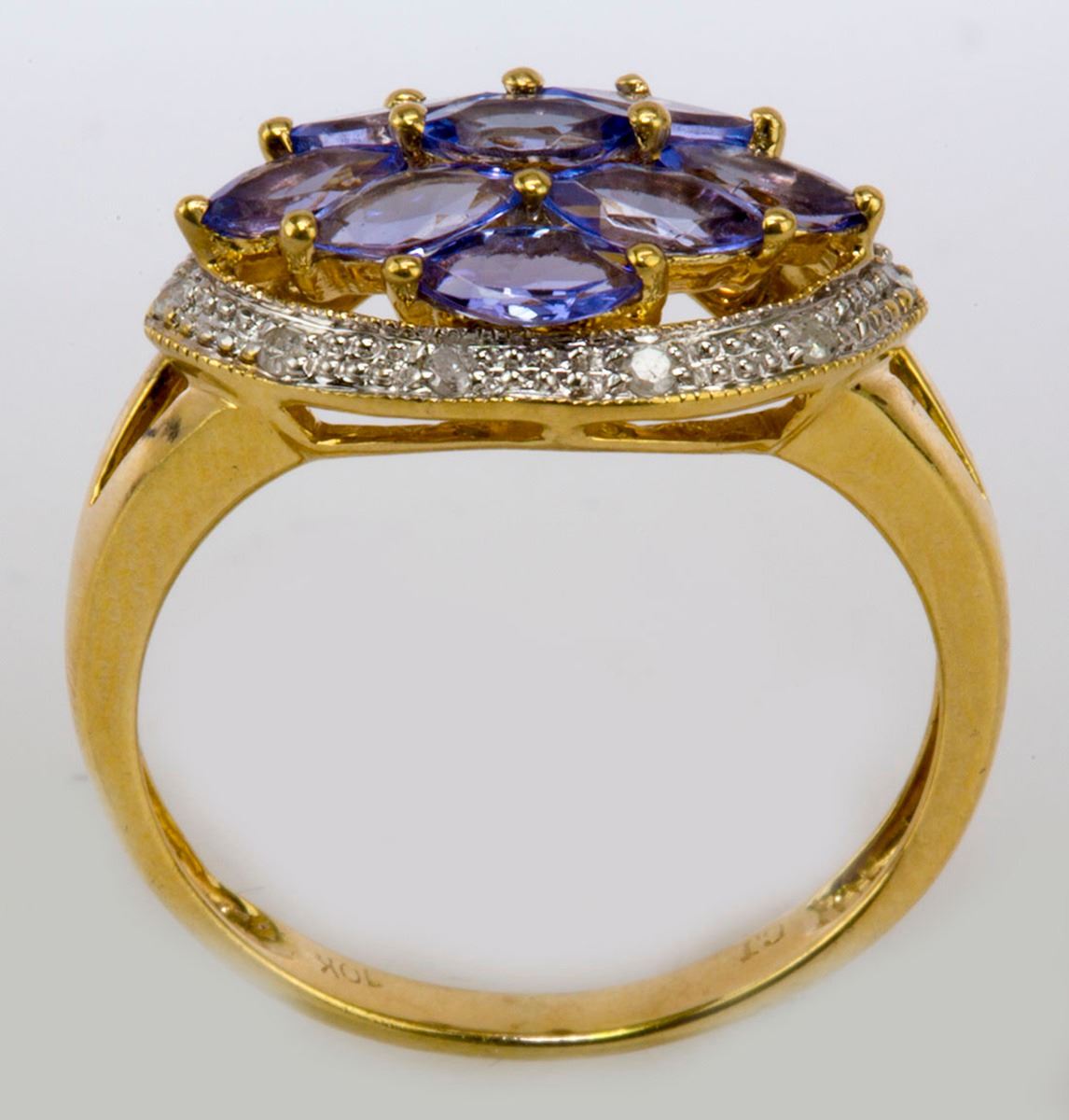 One electronically tested 10KT yellow gold ladies combination cast & assembled tanzanite and diamond ring with a bright polish finish. Identified with markings of "10K". Condition is very good. Containing: Nine prong set marquise modified brilliant cut natural tanzanites, measuring 5.00 x 2.50 x 1.63mm, approximate total weight of 1.17ct., clarity is eye clean, type I, medium light, moderately strong, bluish violet color, cut is good. Ten prong set single cut diamonds, measuring 1.00 - 1.00 x 0.60mm (depth est.) approximate total weight of 10 Stones = 0.04ct. Clarity: I-1 to I-3. Color: H - I. Approximate Total Weight of Colored Stones 1.17ct. Approximate Total Weight of Diamonds 0.04ct. Total Weight of Ring 2.80gm. Ring Size 6.75. The descriptions listed should not be construed as an appraisal. The detail is provided as a guideline for color, clarity, weights and measurements to the best of our ability. We welcome inspections. WE SHIP WORLDWIDE!