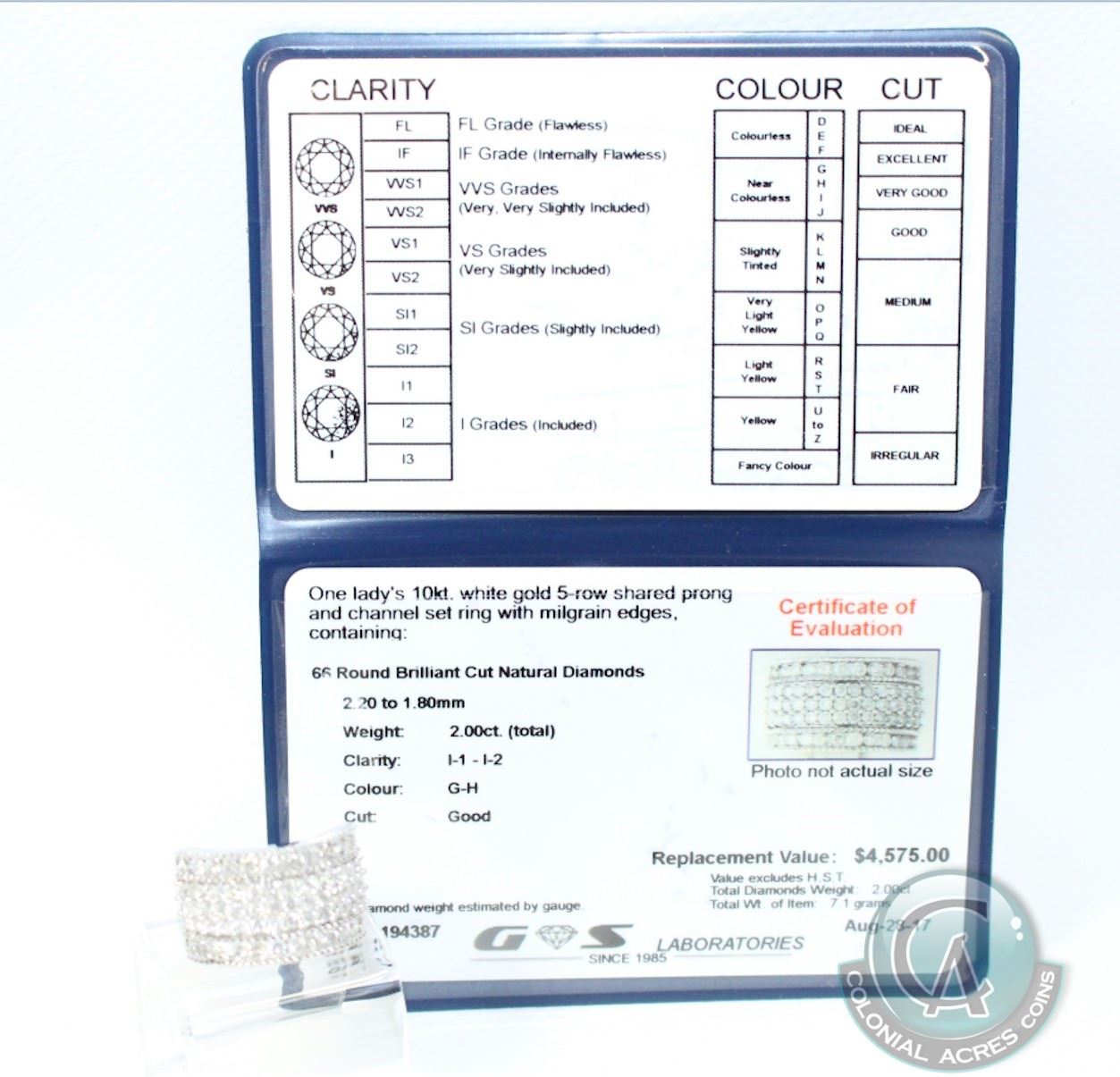 10Kt Gold Lady's 5-row Channel Set ring with 66 Brilliant Cut Diamonds. Item comes with an appraisal by GS Laboratories. Replacement Value is $4575.00. Lady's 10kt white gold 5-row shared prong and channel set ring with miligrain edges, Size 7, containing: 66 Round Brilliant Cut Natural Diamonds; 2.20 to 1.80mm. Weight: 2.00ct (total) . Clarity: I1 - I-2 . Colour: G-H. Cut: Good. Total weight of the item is 7.1 grams. Total diamond weight: 2.00 Ct.