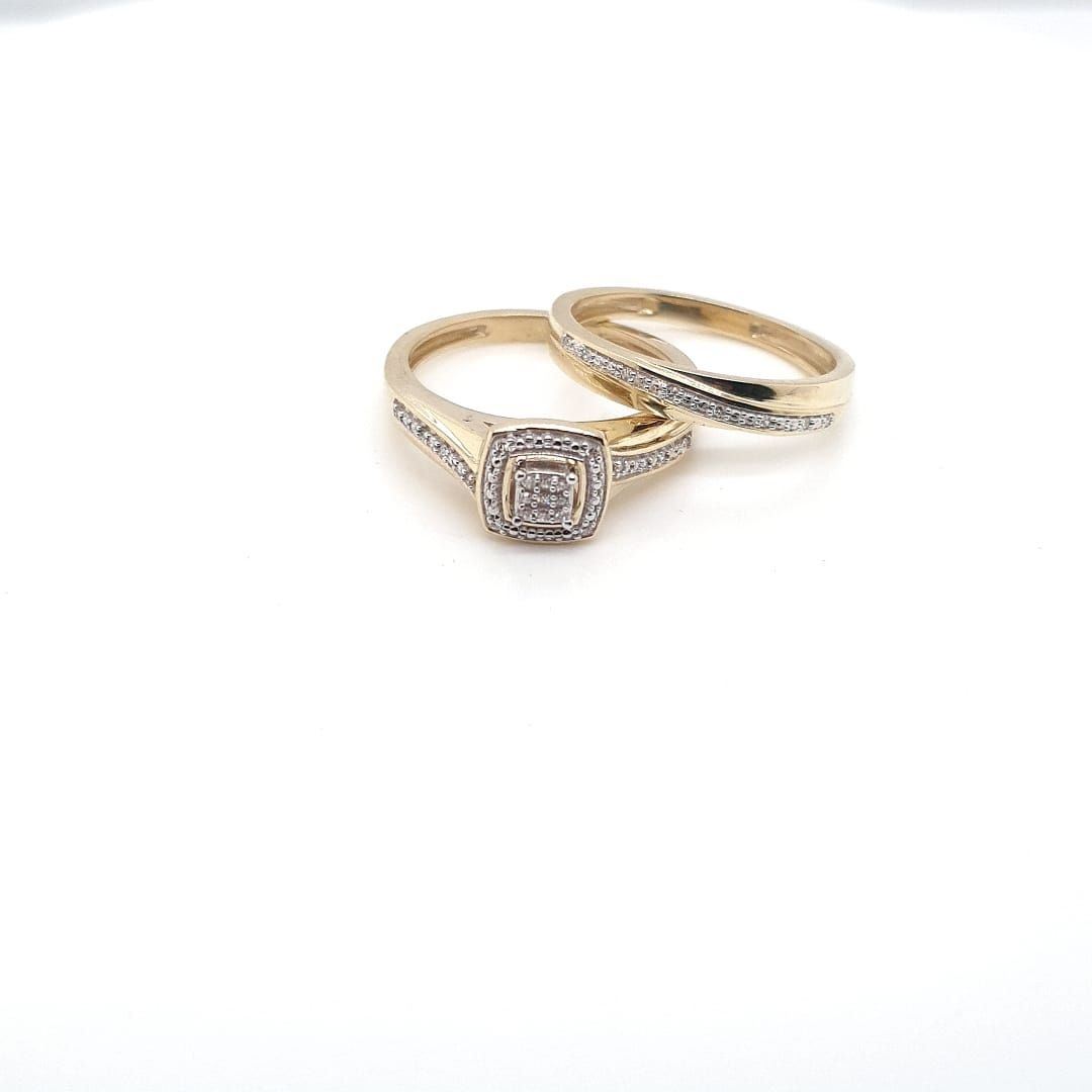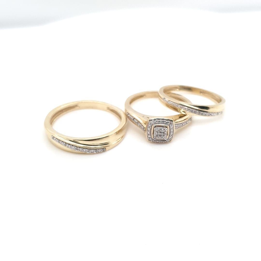 10Kt Yellow Gold Rings. 3 Piece Set With Single Cut Diamonds Set On White Rhodium. With The Engagement Ring With A Matching Band For The Lady & A Matching Band For The Man In The Same Design.