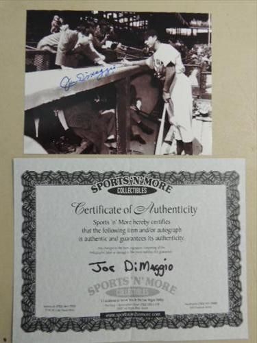 10X8 BASEBALL PHOTO AUTOGRAPHED JOE DIMAGGIO COA. INCLUDES COA FROM SPORTS N MORE. AS SHOWN. VIEW PICTURE FOR DETAIL. PLEASE BE ADVISED, AND INFORMED REGARDING SIGNATURES OR AUTOGRAPHS THAT WE SELL AT AUCTION: WE ARE NOT AUTHENTICATORS, AND WE DO NOT AUTHENTICATE, OR VALIDATE ANY AUTOGRAPHS OR SIGNATURES THAT WE OFFER AT AUCTION. SOME AUTOGRAPHS OR SIGNATURES MAY COME WITH AN AUTHENTICATION FROM ANY ONE OF LITERALLY HUNDREDS OF AUTHENTICATORS ACROSS THE COUNTRY, AND AROUND THE WORLD. WE DO NOT ENDORSE ANY AUTHENTICATOR, NOR DO WE GUARANTEE THAT ANY AUTOGRAPH OR SIGNATURE IS AUTHENTIC, OR THAT IT WILL PASS AUTHENTICATION BY ANY AUTHENTICATOR. ALL AUTOGRAPHS OR SIGNATURES ARE SOLD