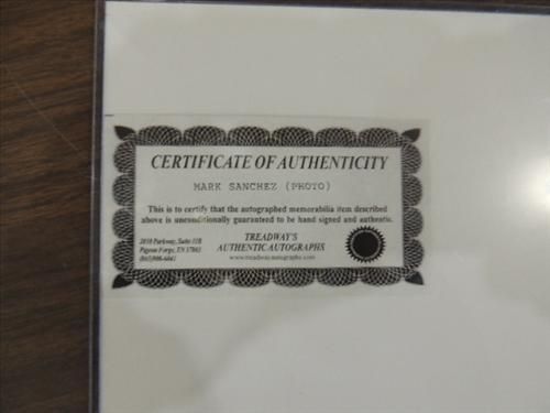10X8 FOOTBALL PHOTO AUOTGRAPHED MARK SANCHEZ COA. INCLUDES COA FROM TREADWAYS AUTHENTICS. AS SHOWN. VIEW PICTURE FOR DETAIL. PLEASE BE ADVISED, AND INFORMED REGARDING SIGNATURES OR AUTOGRAPHS THAT WE SELL AT AUCTION: WE ARE NOT AUTHENTICATORS, AND WE DO NOT AUTHENTICATE, OR VALIDATE ANY AUTOGRAPHS OR SIGNATURES THAT WE OFFER AT AUCTION. SOME AUTOGRAPHS OR SIGNATURES MAY COME WITH AN AUTHENTICATION FROM ANY ONE OF LITERALLY HUNDREDS OF AUTHENTICATORS ACROSS THE COUNTRY, AND AROUND THE WORLD. WE DO NOT ENDORSE ANY AUTHENTICATOR, NOR DO WE GUARANTEE THAT ANY AUTOGRAPH OR SIGNATURE IS AUTHENTIC, OR THAT IT WILL PASS AUTHENTICATION BY ANY AUTHENTICATOR. ALL AUTOGRAPHS OR SIGNATURES ARE SOLD