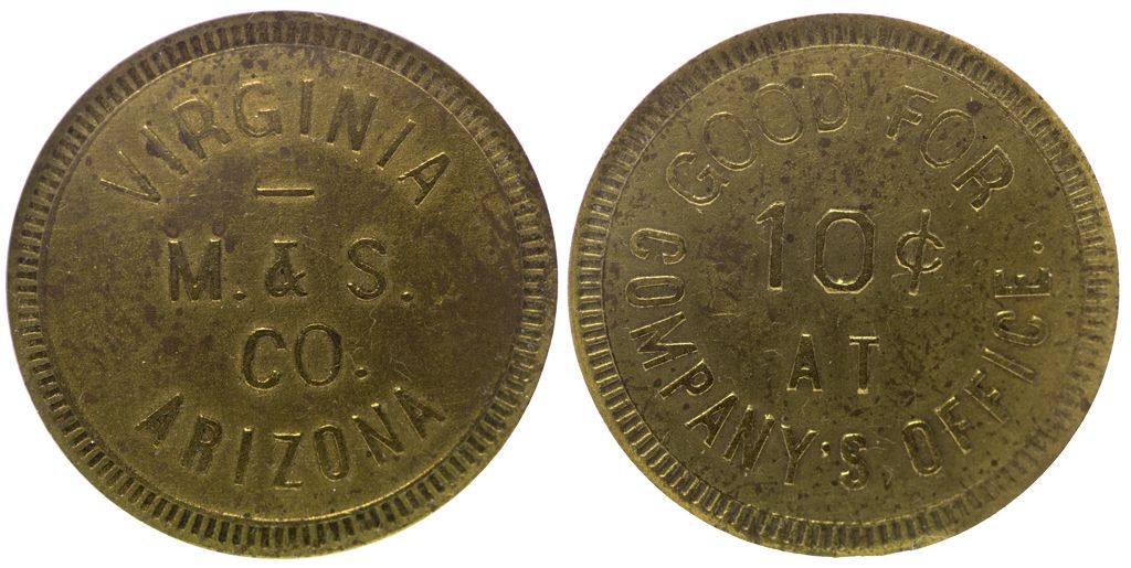 Round brass, 20mm obv.: "Good For/ 10c/ At/ Company`s Office." rev.: "Virginia/ M. & S./ Co./ Arizona". Slabbed by NCS and certified Genuine. Serial # 5115125-224. Another great ghost town piece. Listed in Spooner`s 2010 Arizona token book, which also notes that the company was listed in a 1905 business directory in nearby Casa Grande. Vekol was located in the desert about 10-20 miles southwest of the present town of Casa Grande in south-central Arizona. The lack of the town name on the token indicates that they operated and accepted tokens in both Vokel and Casa Grande.City: VekolCounty: Pinal State: AZDate: c1905