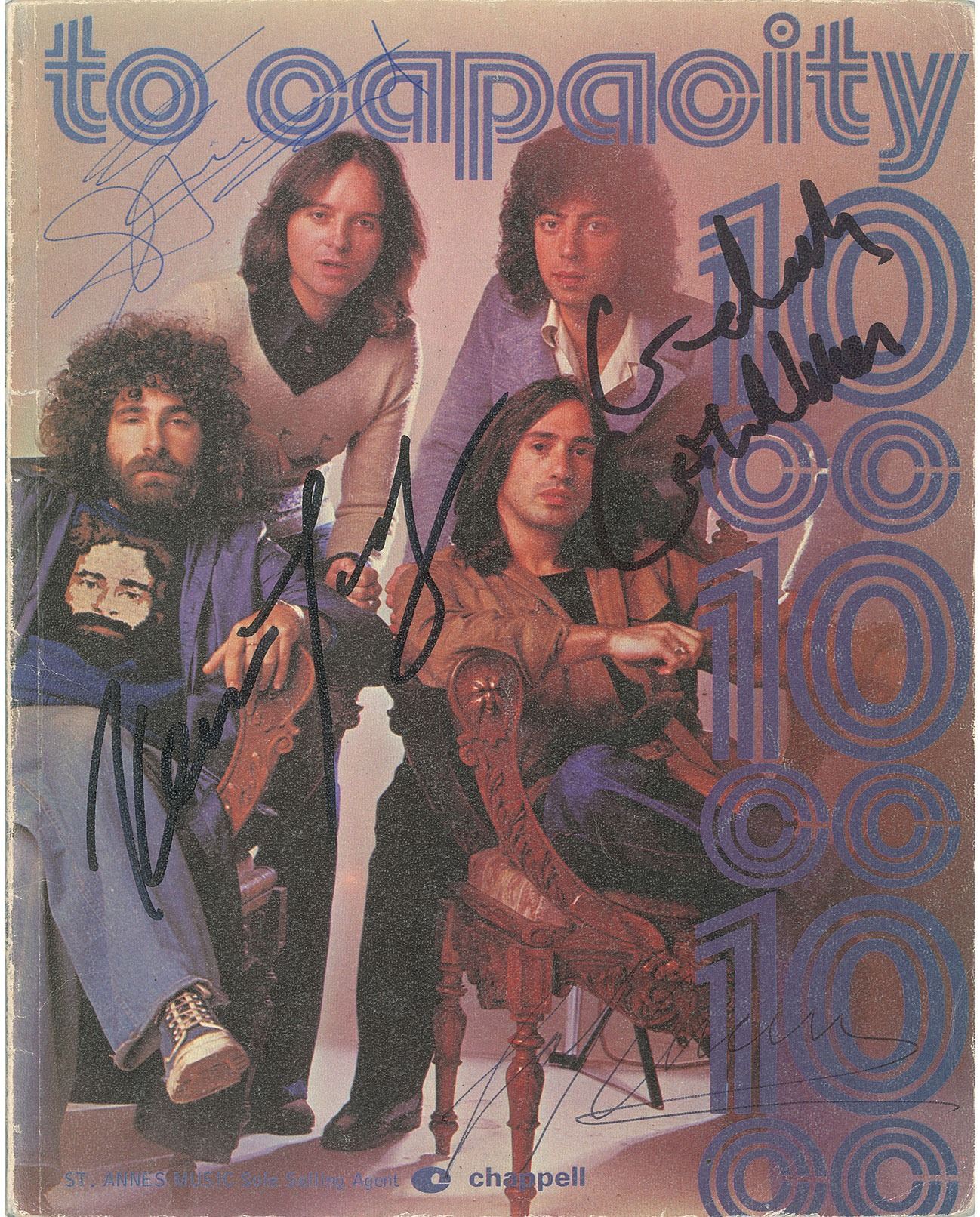 Sheet music songbook entitled "To Capacity," published in 1975 by Chappell, 8.5 x 11, 56 pages, signed on the front cover in black tip and ballpoint by Graham Gouldman, Eric Stewart, Lol Creme, and Kevin Godley. In very good condition, with rubbing, creases, and a few tiny tears to cover, and some light contrast to signatures.