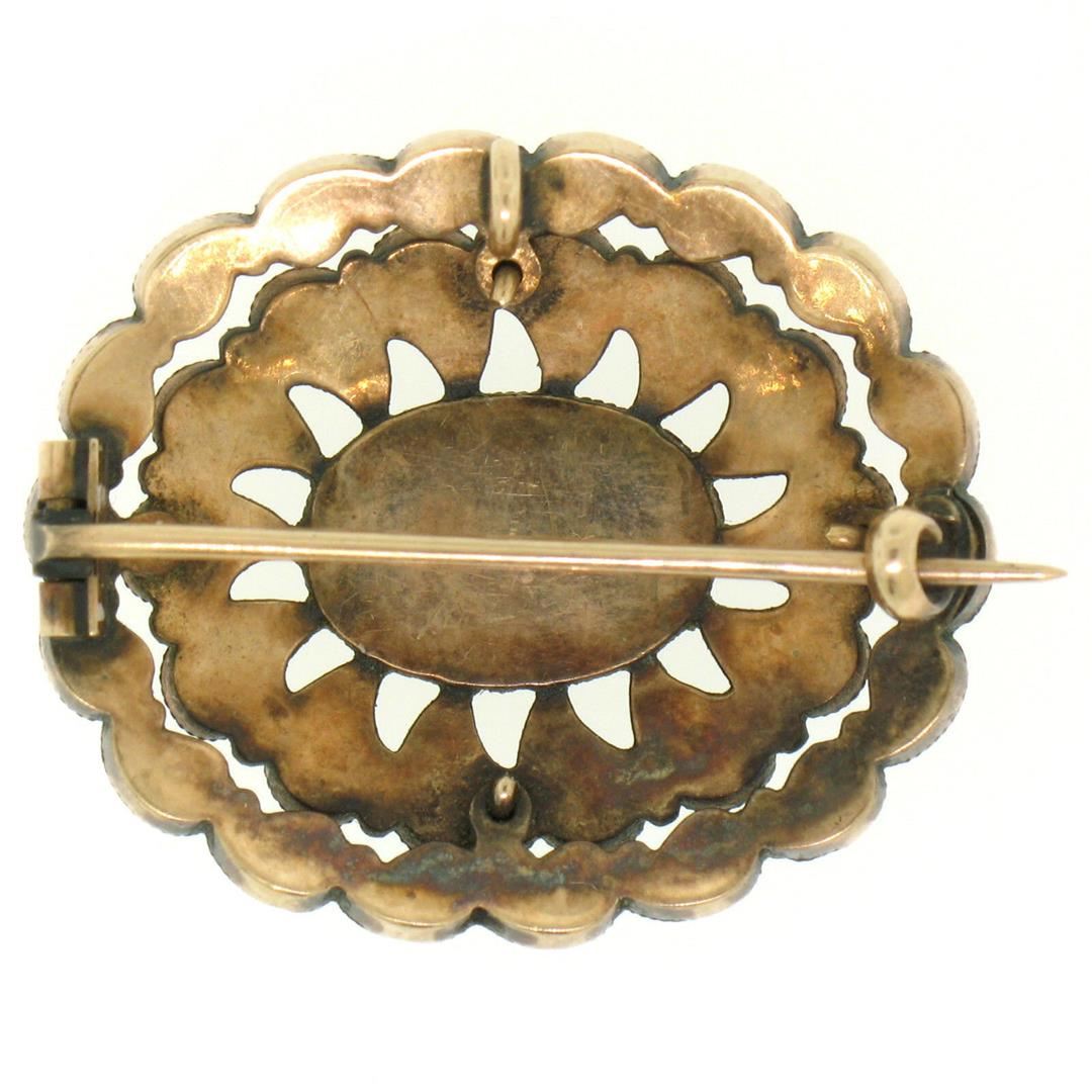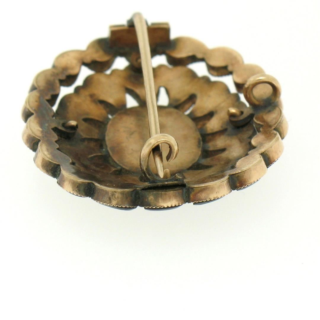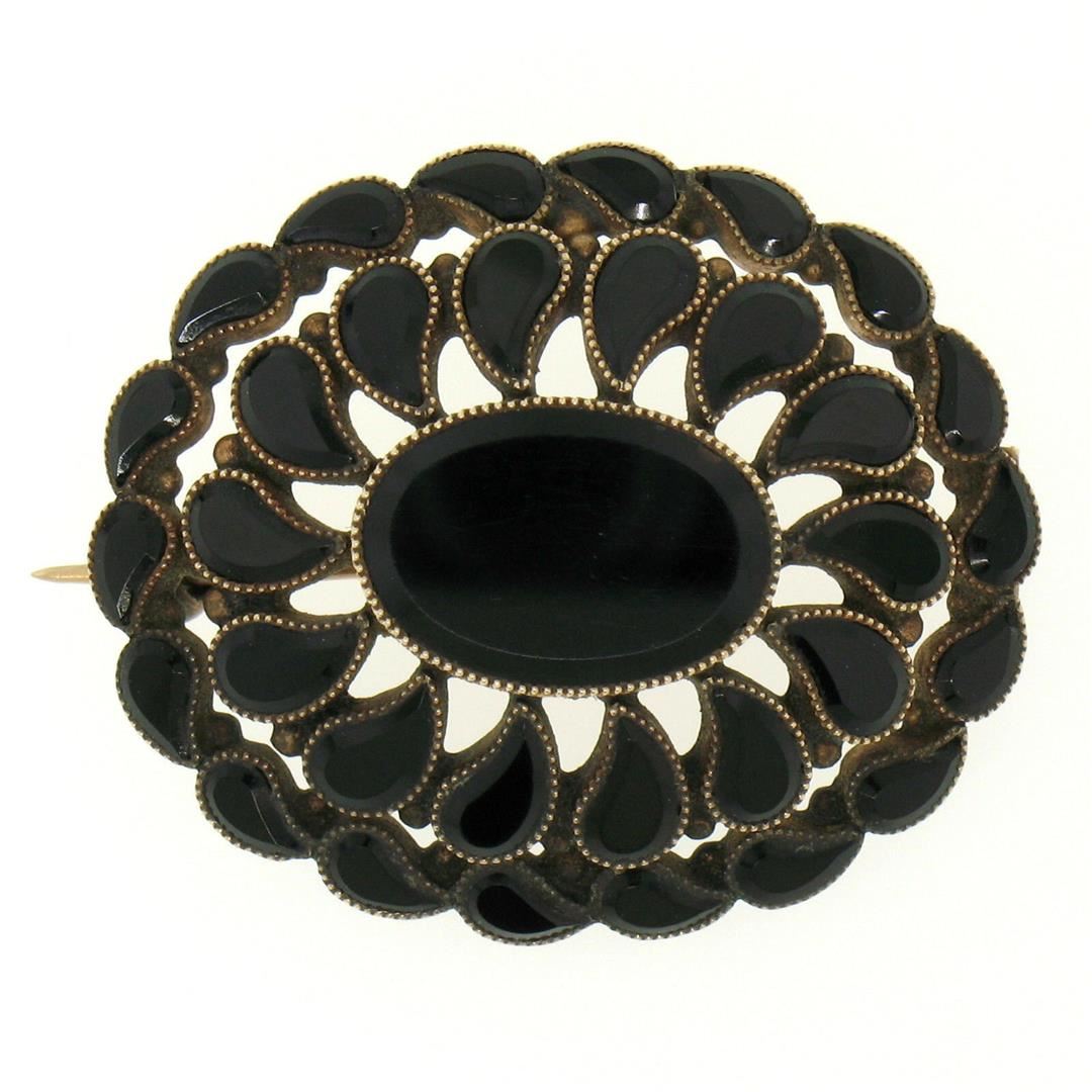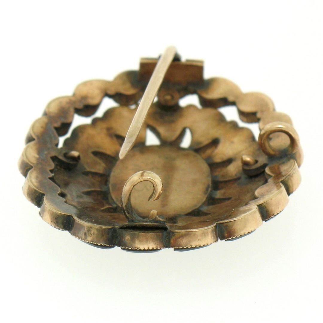 One Antique Victorian 10k Rosy Yellow Gold CUSTOM CUT Black Onyx Milgrain Brooch Pin Pendant. Item Details: Material: 10K Rosy Yellow Gold, Total Weight: 5.3 Grams, Stone(s): (1) Natural Genuine Black Onyx - Oval Shape - Bezel Set - 12.5x8.5mm, (32) Natural Genuine Black Onyx - CUSTOM Cut Tear Drop Shapes - Bezel Set, Overall Height: 25.5mm, Overall Width: 30mm, Overall Thickness: 6.3mm (not including the pin), Condition: Custom-made antique piece. All original, amazing condition overall!