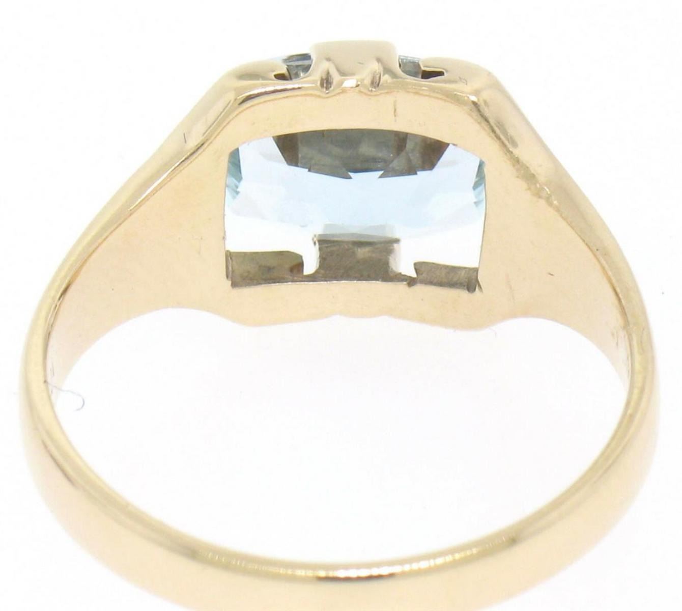 One Vintage 10k Solid Gold Cushion Cut Horizontal Aquamarine Solitaire Ladies Ring. Item Details - Material: Solid 10K Yellow Gold, Weight: 4.80 Grams , Stone(s): (1) Natural Genuine Aquamarine - Cushion Cut - Prong Set - Crystal Clear Light Blue - 10.36x8.16mm - 2.50 ct (approx.), Size: 9.0, Dimensions: Measures 11.60mm side to side by 10.23mm top to bottom, Condition: Vintage estate piece in excellent condition.