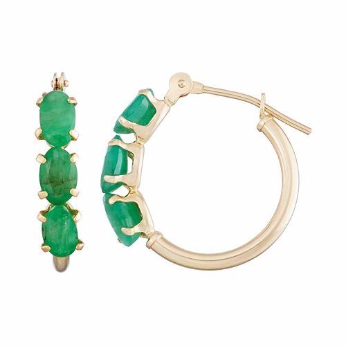 Accentuated with oval-cut genuine emerald stones, these 10k gold tube hoop earrings exude a brilliant look. EARRING DETAILSDiameter: .64 in.Backings: click-itMetal: 10k goldPackaging: boxed STONE DETAILSStone type: emeraldTotal weight: 1 3/4 ct.Shape: ovalSetting: prong