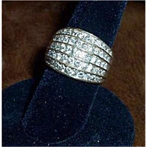 Illusion set 10kt gold wide semi-domed band with five rows of brilliant channel mounted, fully faceted round diamonds.<BR><BR>Estate disbursal acquisition in which we obtained a written Jeweler's Appraisal, stating as follows:<BR><BR>"10kt (stamped) yellow gold Diamond Fashion ring. Sixty round brilliant diamonds (5 rows of 12) are bead set in an Illusion style Channel mounting. Diamonds range in size from .01 cts to .04 cts each with an approximate total carat weight of 1.25 cts. They are I1 in clarity and M-O in color. Total weight of the ring including stones equals 4.4dwt.<BR><BR>Retail Replacement Value $1,219.60.<BR><BR>Ring is bold and beautiful, yet classically elegant and measures .75 inches wide. Ring size is 7. Stones are tight in mounting.<BR><BR>