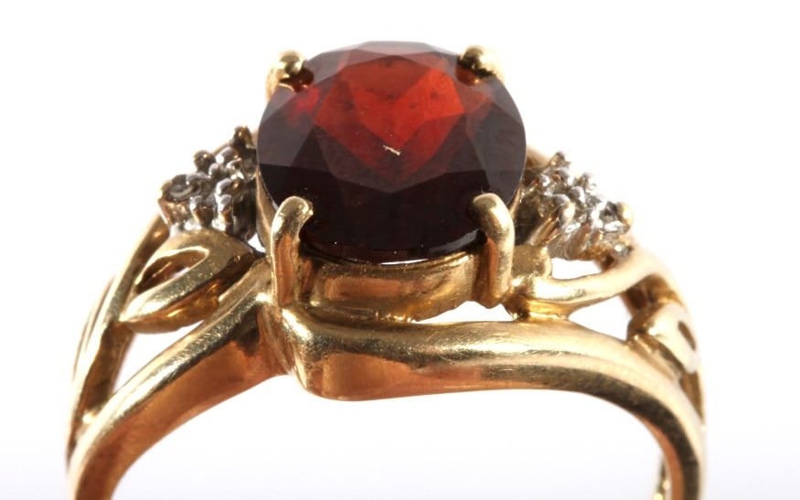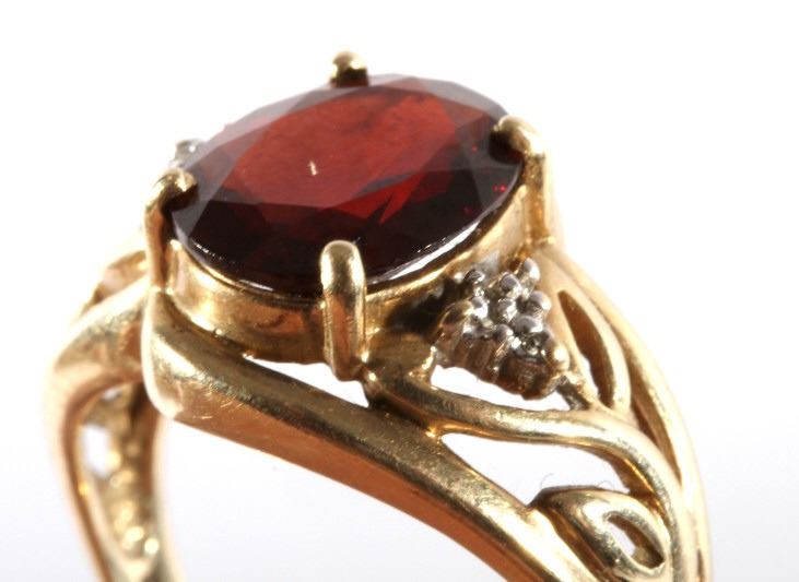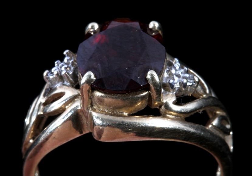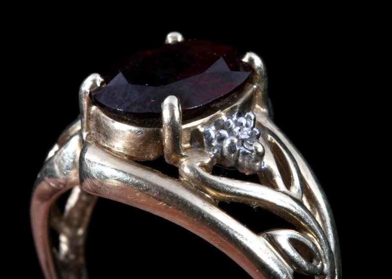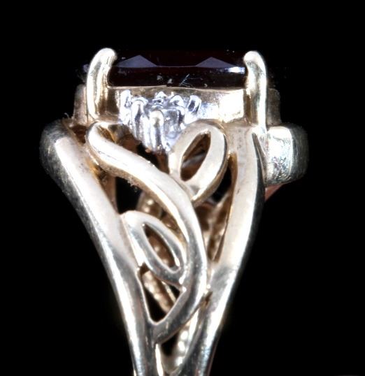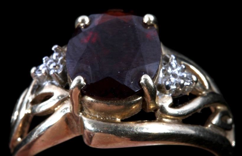 This is a designer Cocktail ring constructed of 10k yellow gold with a beautiful oval cut Garnet center stone. The ring is marked 10k and the designer THL. The early piece is in good condition and is a size 7.