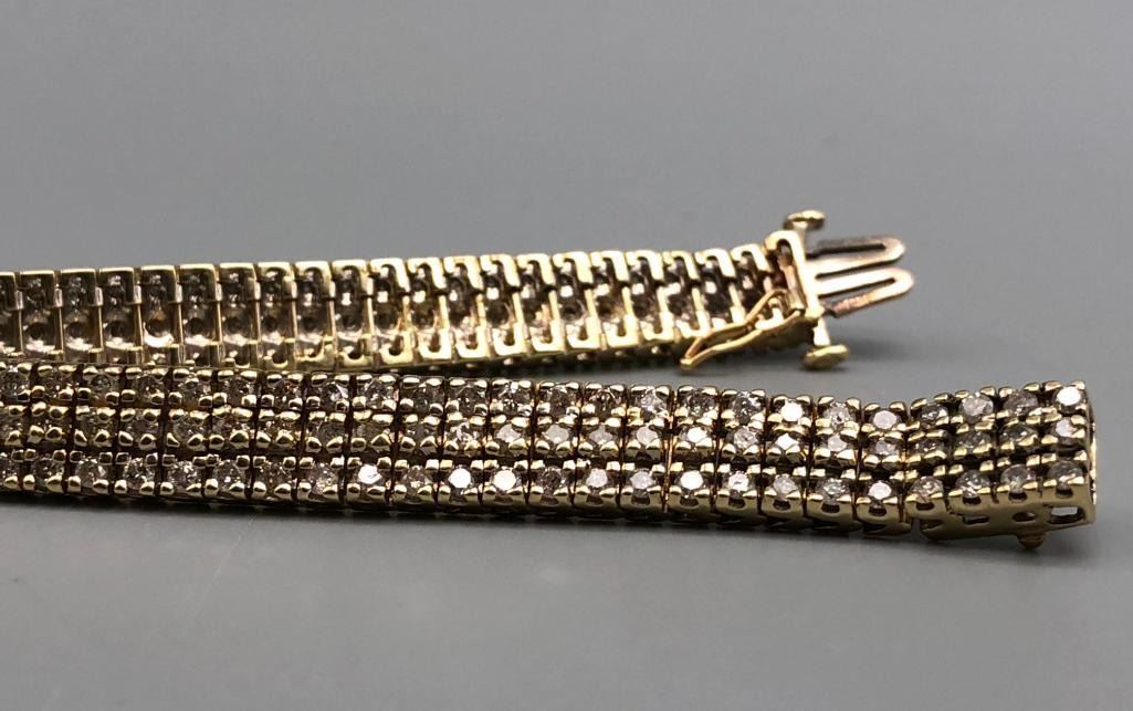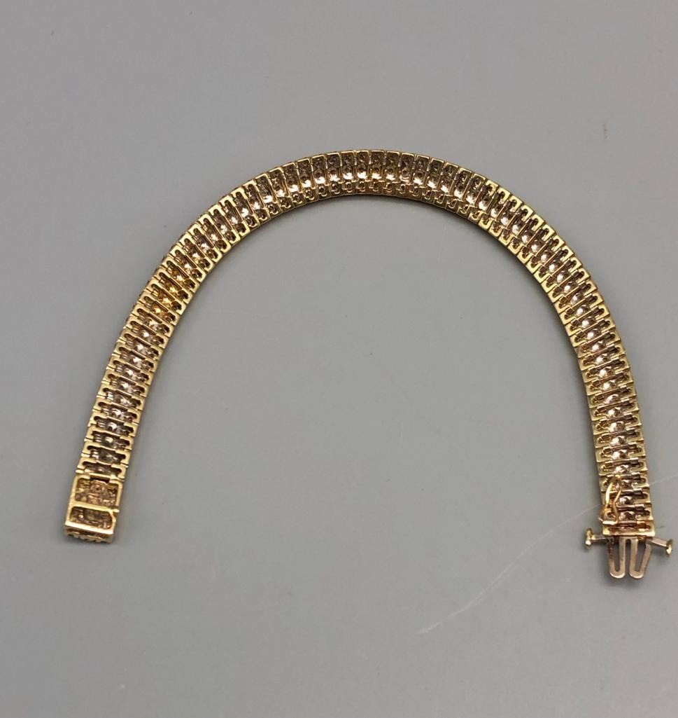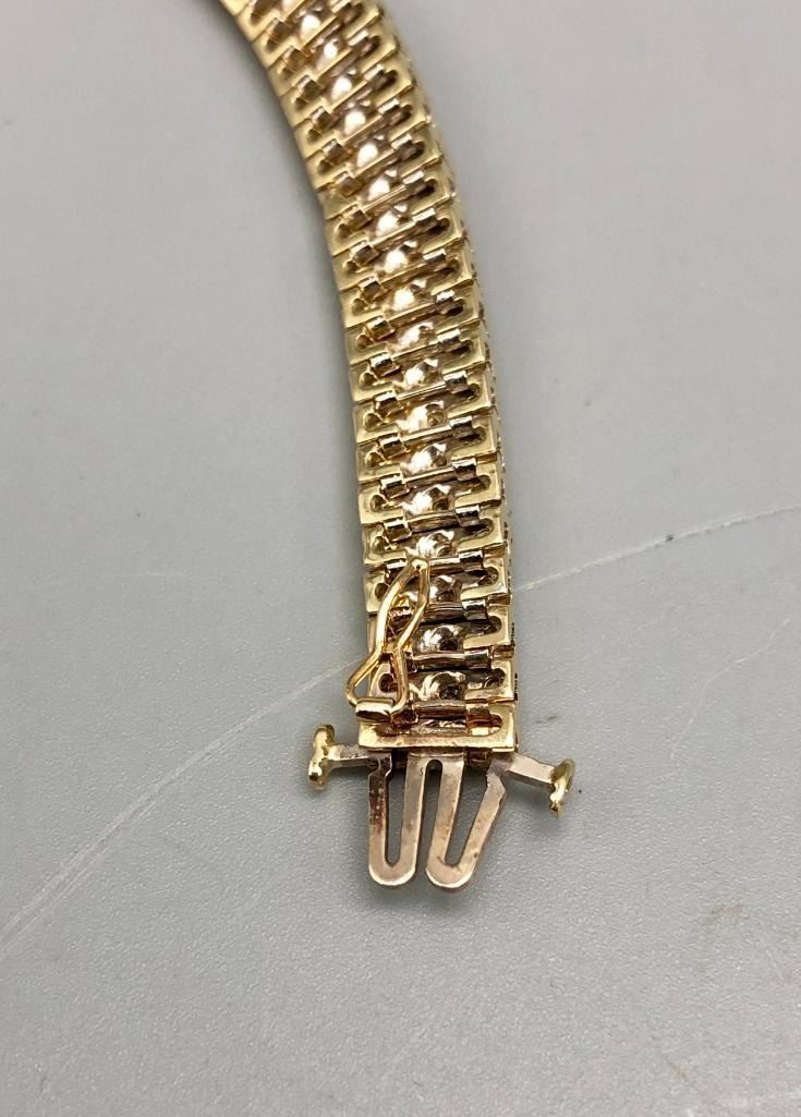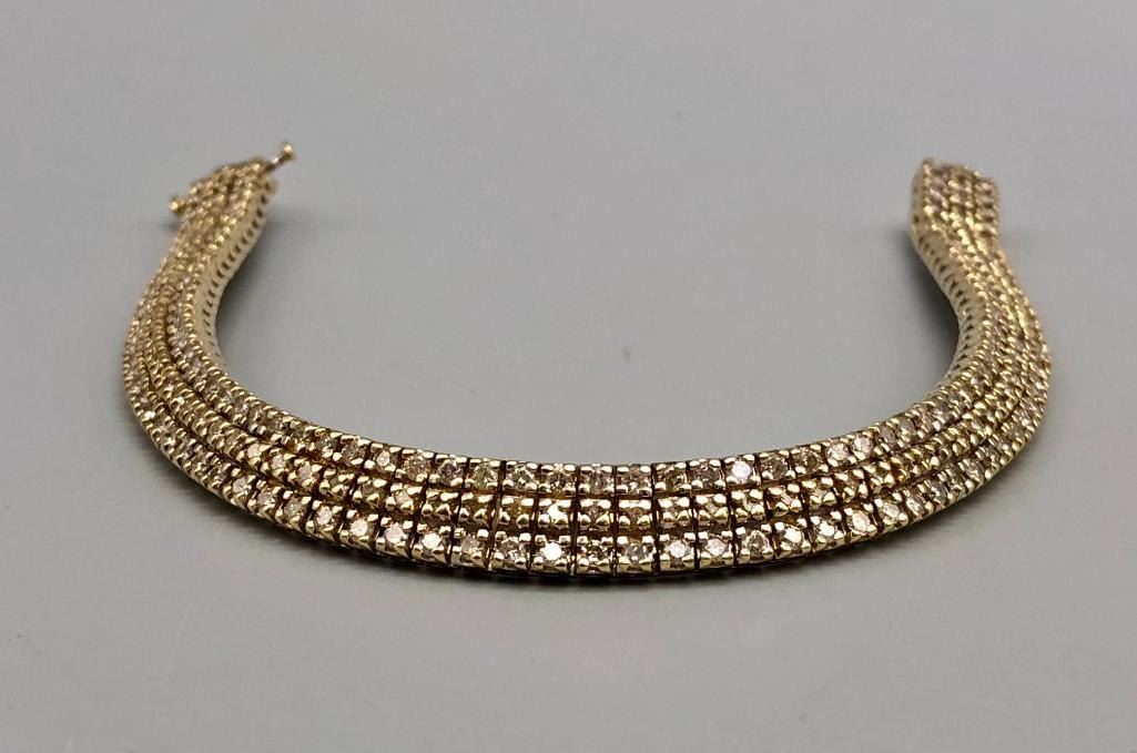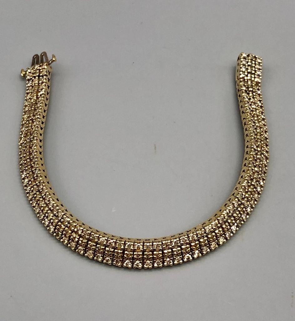 For sale in this lot is a 10k gold and diamond tennis bracelet. This is an elegant gold bracelet, with a nice wider band that is set with over approximately 5 carats of diamonds. It is made from 10k gold. MAKER: Unmarked. APPROX AGE: Fairly modern. SIZE: Measures 7-3/4 inches long X 3/8 inches wide. Weighs 24.4 grams. CONDITION: Good for its age, normal wear expected. Please look closely at the pictures as they are an important part of our description and are hereby incorporated into the description, specifically with regards to condition. SHIPPING: There will be a $5 handling / packaging fee for shipping this lot. The actual cost of postage will be added on top of that. BUY IT NOW: If you would like to buy this item now, without waiting for the auction day to bid on it, we do offer this option (which is available up to 48 hours before the actual auction starts). The “Buy it Now†price is the high estimate of this lot (plus applicable fees and the Buyer's premium is discounted to 10% when using the Buy it Now option). If you would like to exercise this option, you must contact us by email (or phone as long as you talk to someone live). Reference this lot number and your intention to "Buy it Now."