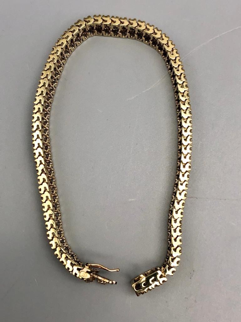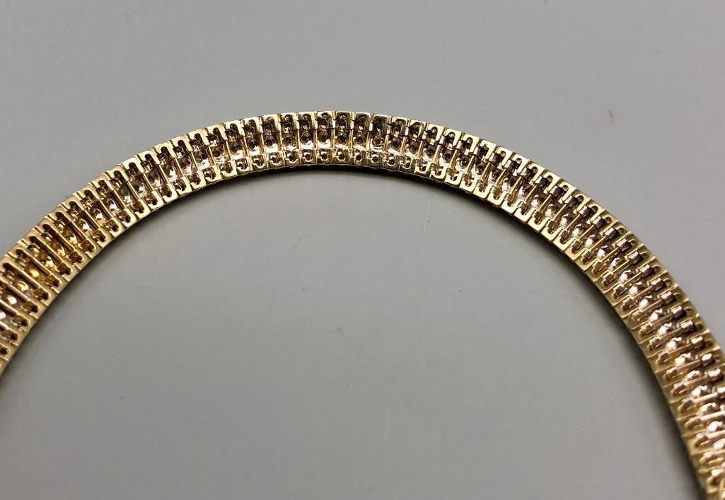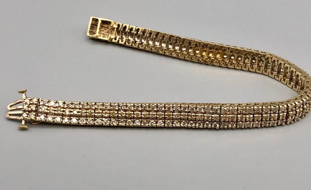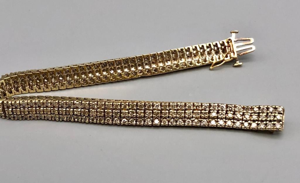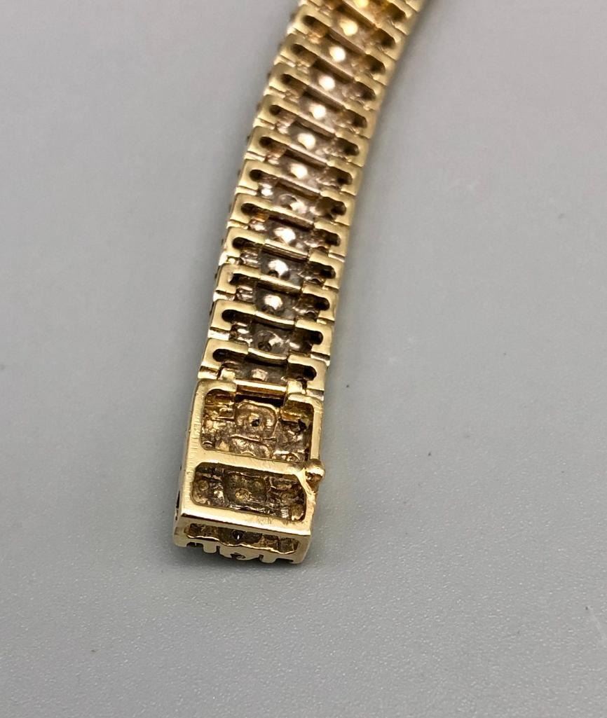 For sale in this lot is a 10k gold and diamond tennis bracelet. This is an elegant gold bracelet, with a nice wider band that is set with over approximately 5 carats of diamonds. It is made from 10k gold. MAKER: Unmarked. APPROX AGE: Fairly modern. SIZE: Measures 7-3/4 inches long X 3/8 inches wide. Weighs 24.4 grams. CONDITION: Good for its age, normal wear expected. Please look closely at the pictures as they are an important part of our description and are hereby incorporated into the description, specifically with regards to condition. SHIPPING: There will be a $5 handling / packaging fee for shipping this lot. The actual cost of postage will be added on top of that. BUY IT NOW: If you would like to buy this item now, without waiting for the auction day to bid on it, we do offer this option (which is available up to 48 hours before the actual auction starts). The “Buy it Now†price is the high estimate of this lot (plus applicable fees and the Buyer's premium is discounted to 10% when using the Buy it Now option). If you would like to exercise this option, you must contact us by email (or phone as long as you talk to someone live). Reference this lot number and your intention to "Buy it Now."