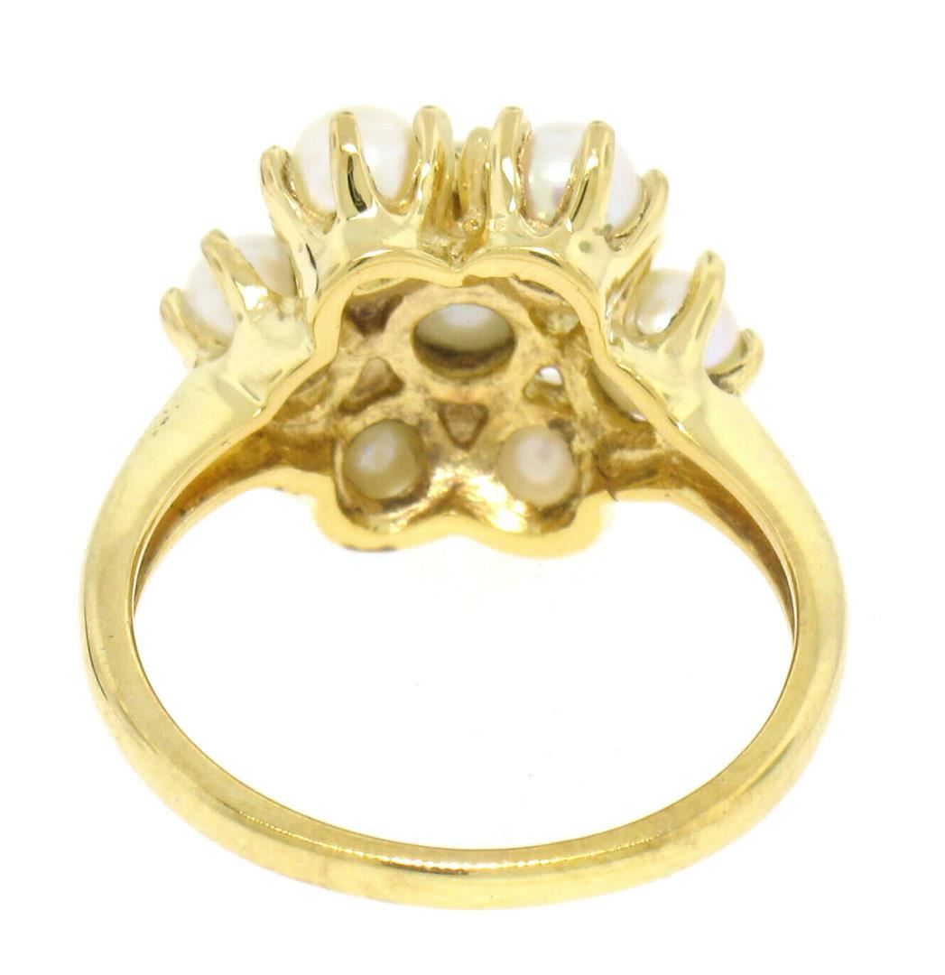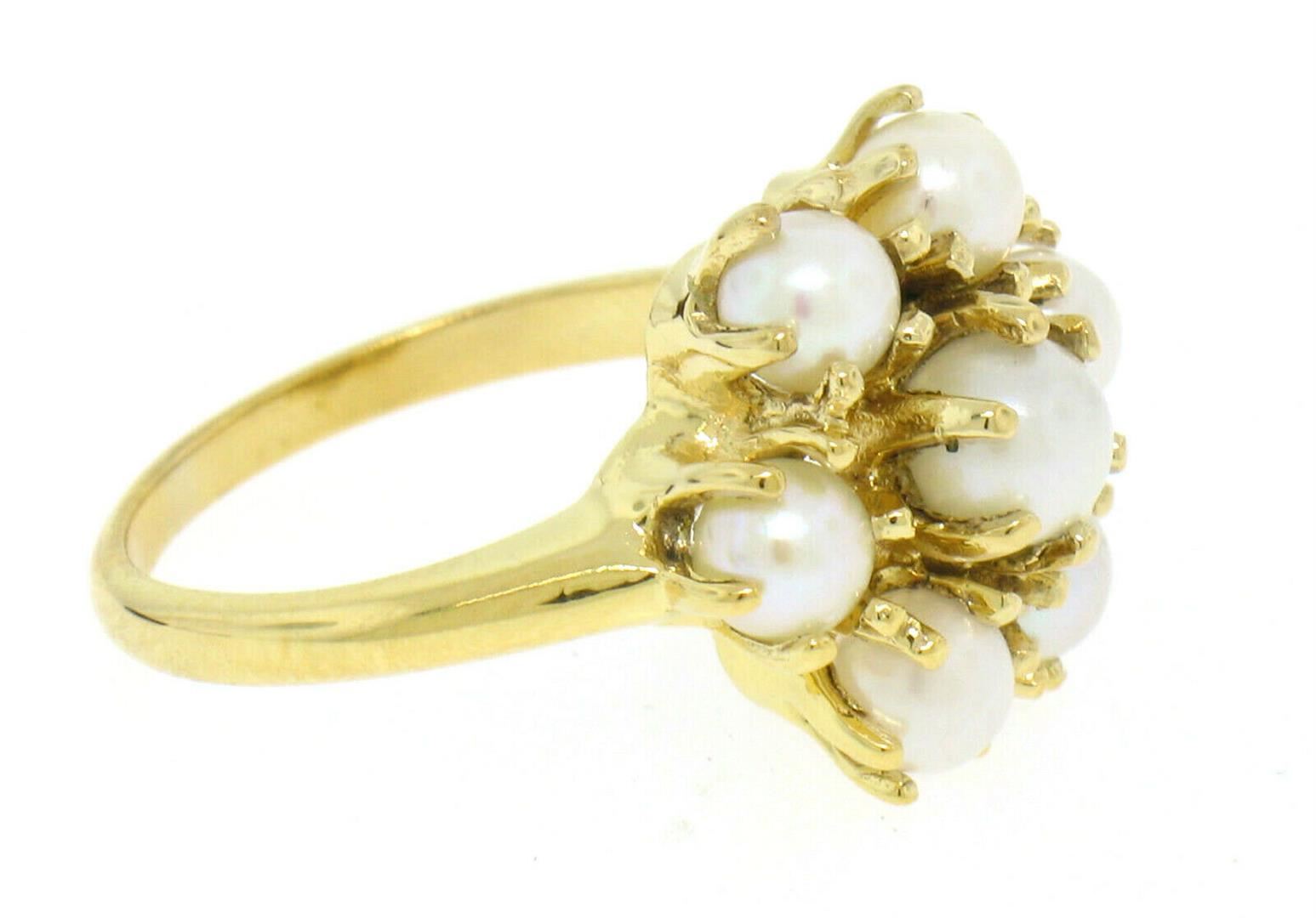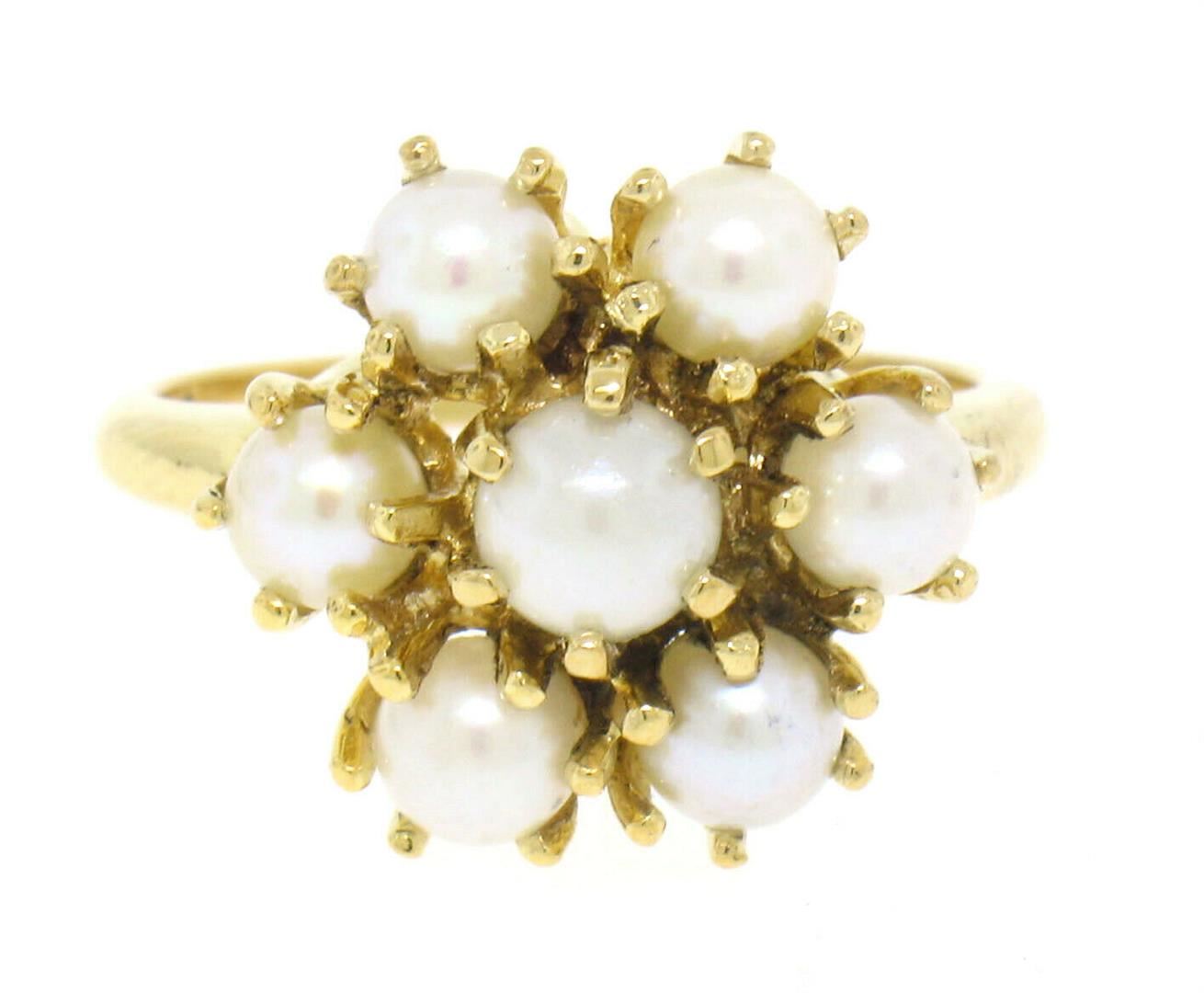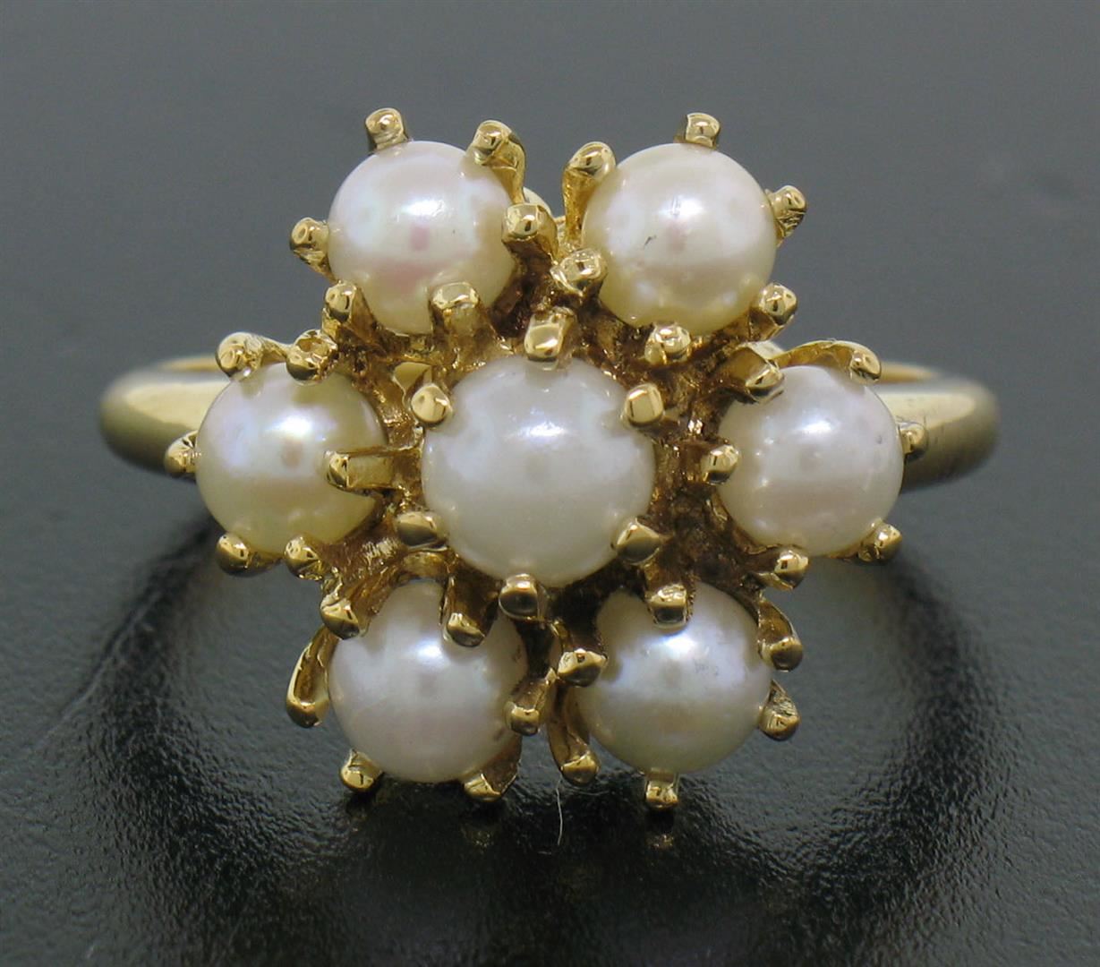 One Vintage 10K Solid Yellow Gold Round Pearl Cluster Ladies Dinner Ring. Material: 10K Solid Yellow Gold: Weight: 4.60 Grams , Stone(s): (1) Genuine Cultured Akoya Pearl - Round Shape - Pure White Color - 5.0mm (approx.), (6) Genuine Cultured Akoya Pearls - Round Shape - Pure White Color - 4.0mm (approx.), Width: 16.13mm, Size: 6.0, Condition: Vintage piece in excellent condition.